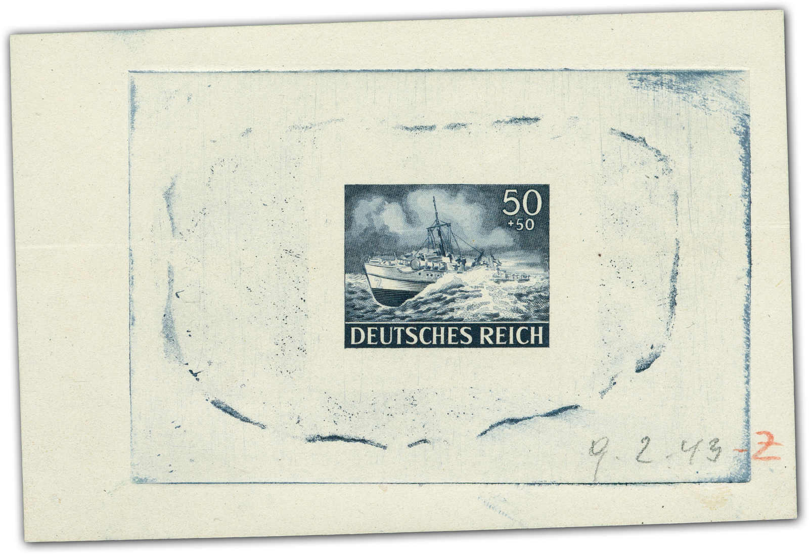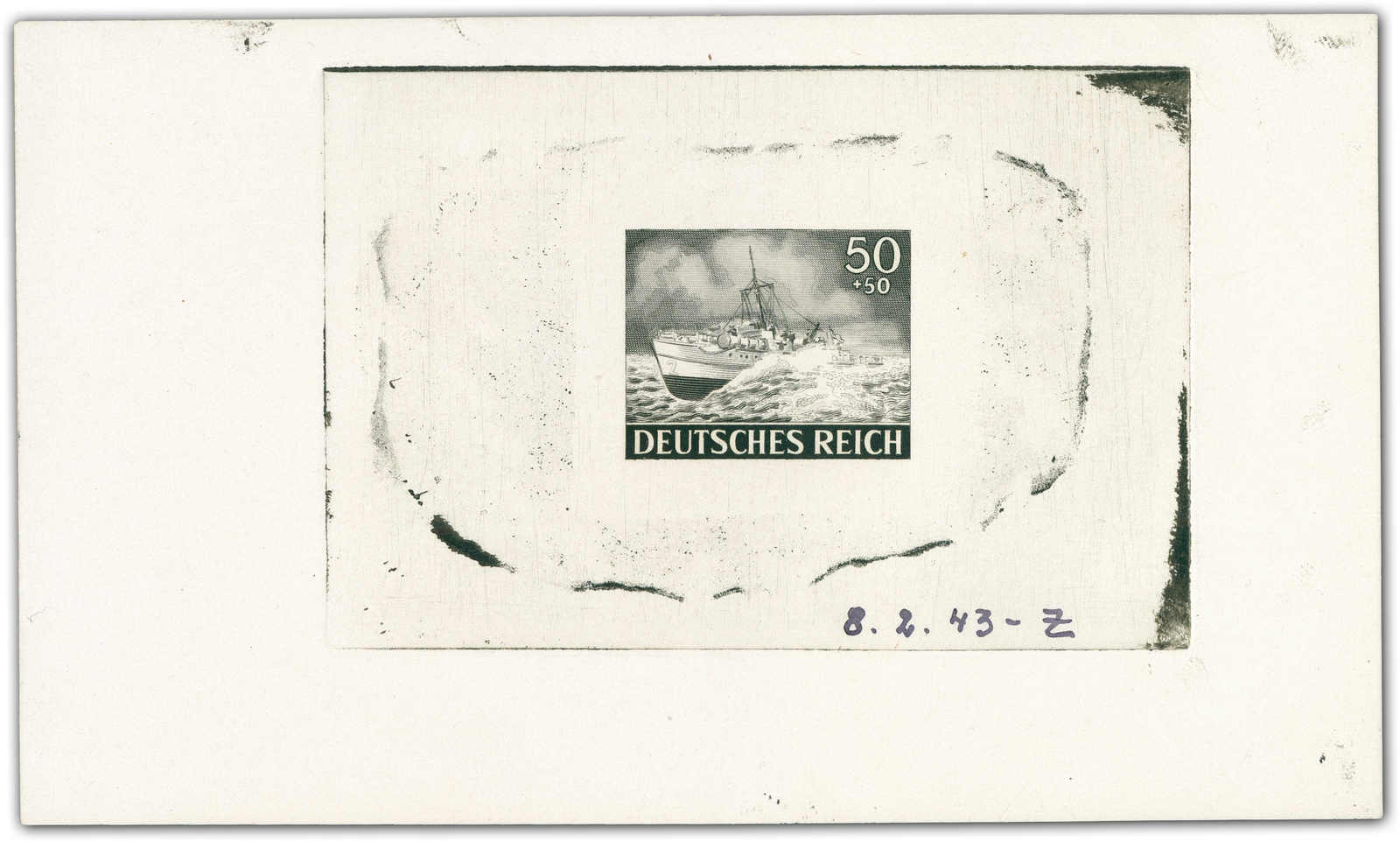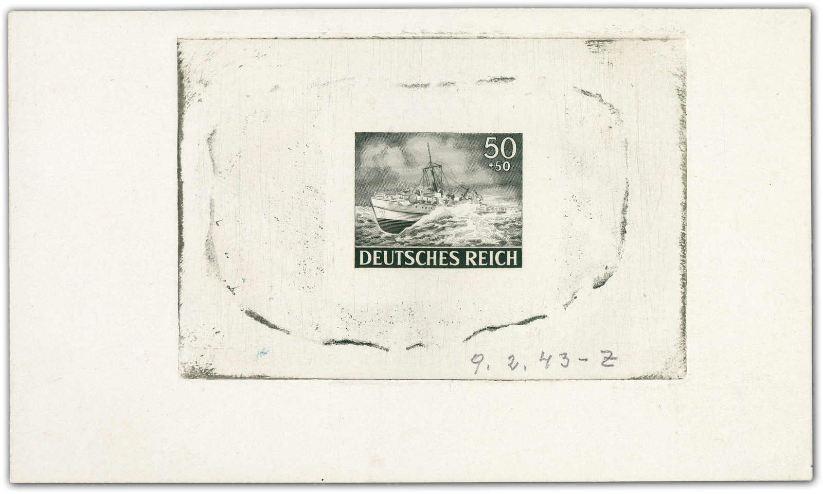 Motif „speedboat“ Print taken from the finished die. Datelined by the printer at bottom “9.2.43“ and a short signature “Z“. (Image)