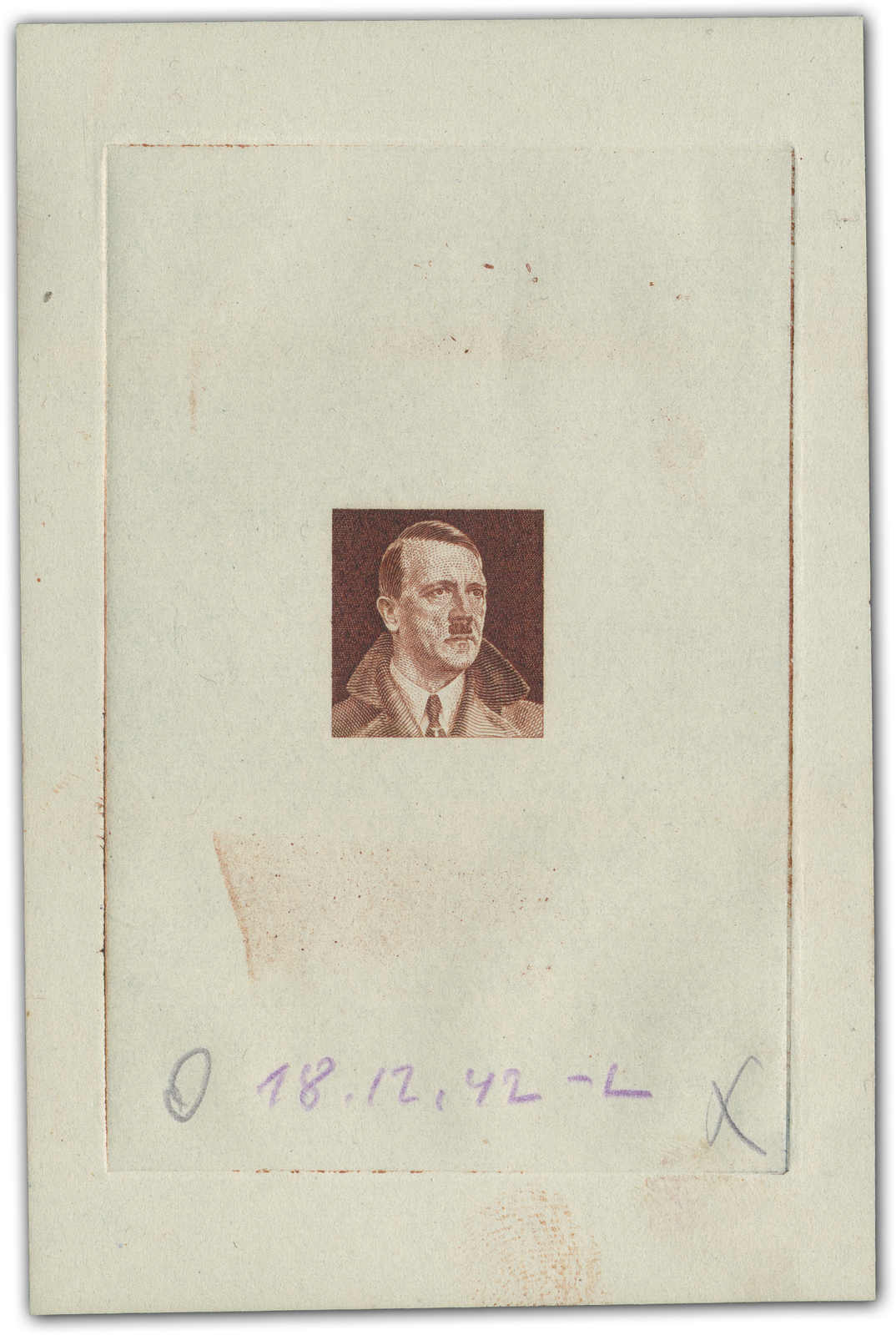 The portrait “Hitler with turned up coat collar“ was proposed for the “Mark“ values. The ministry for propaganda judged it as good but too “casual“. The dateline “18.12.42“ at bottom with initial “L“ came from the printer (Image)
