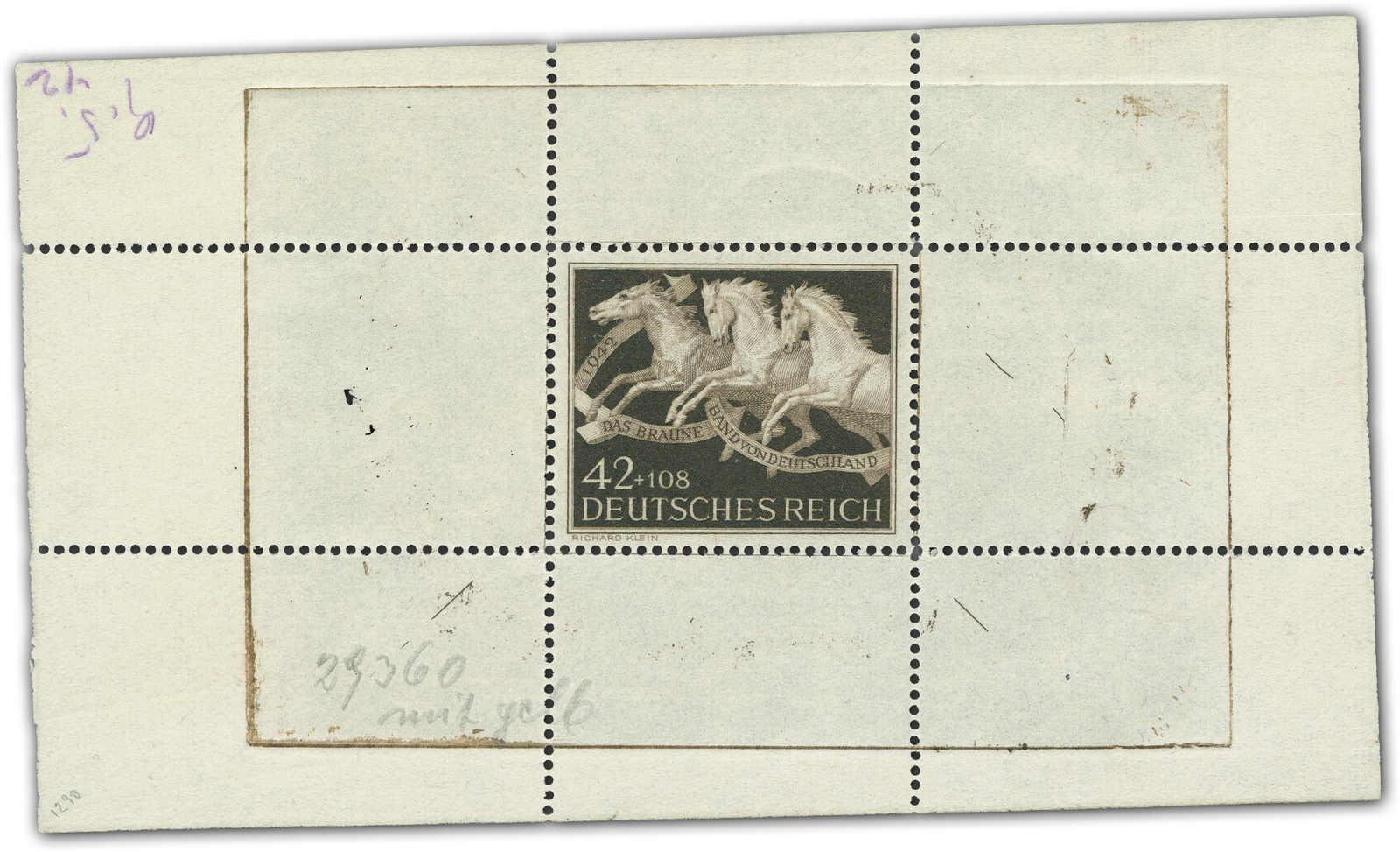 The Brown Ribbon 1942 Print taken from the original die. The sheet of the 2nd version – now perforated. At bottom manuscript notes with internal control number. (Image)