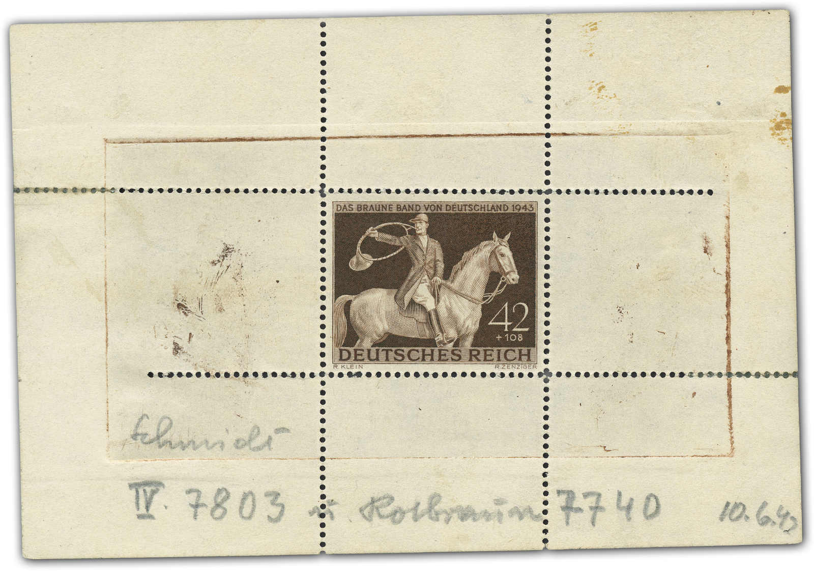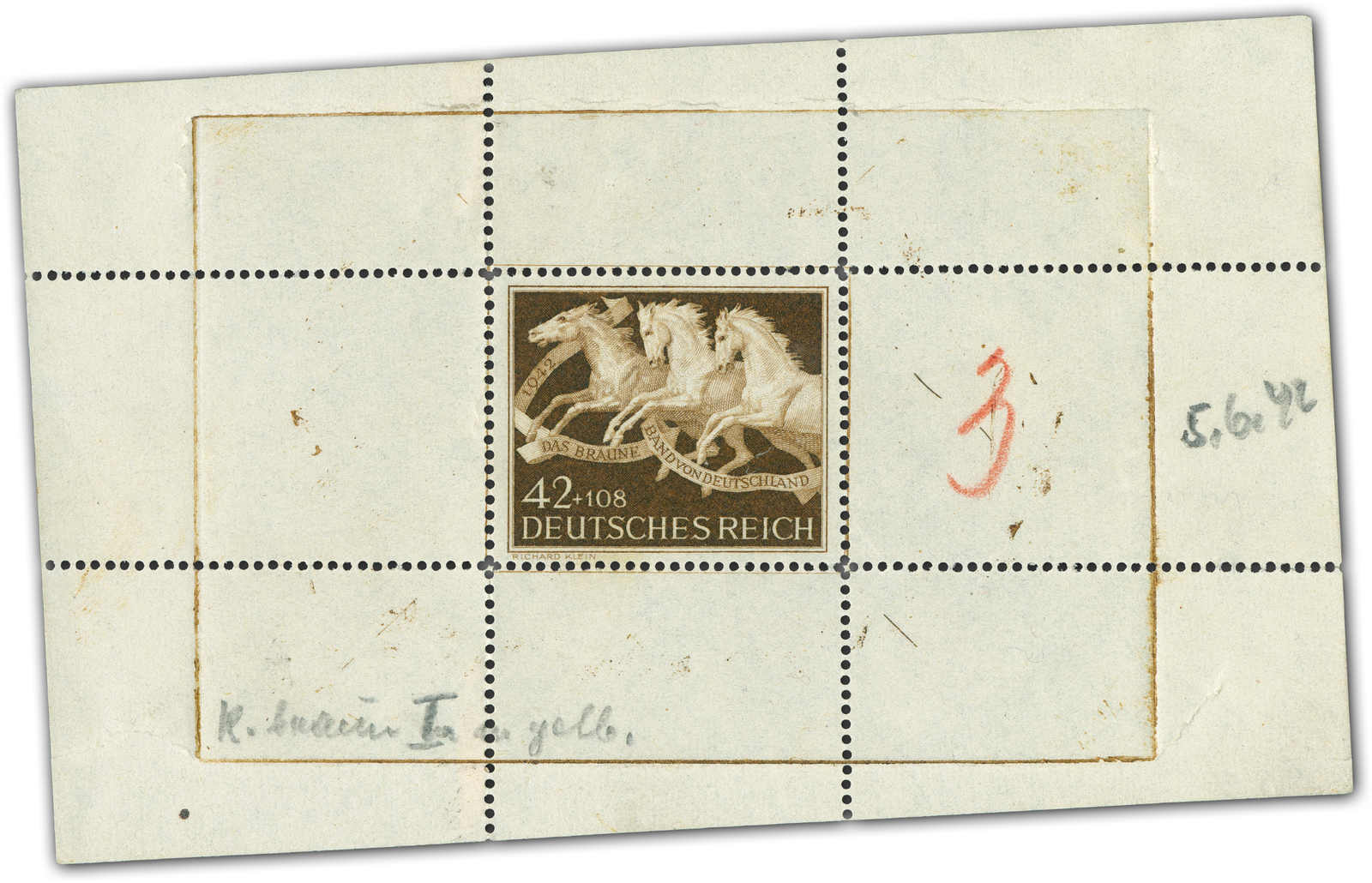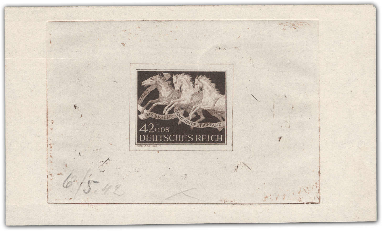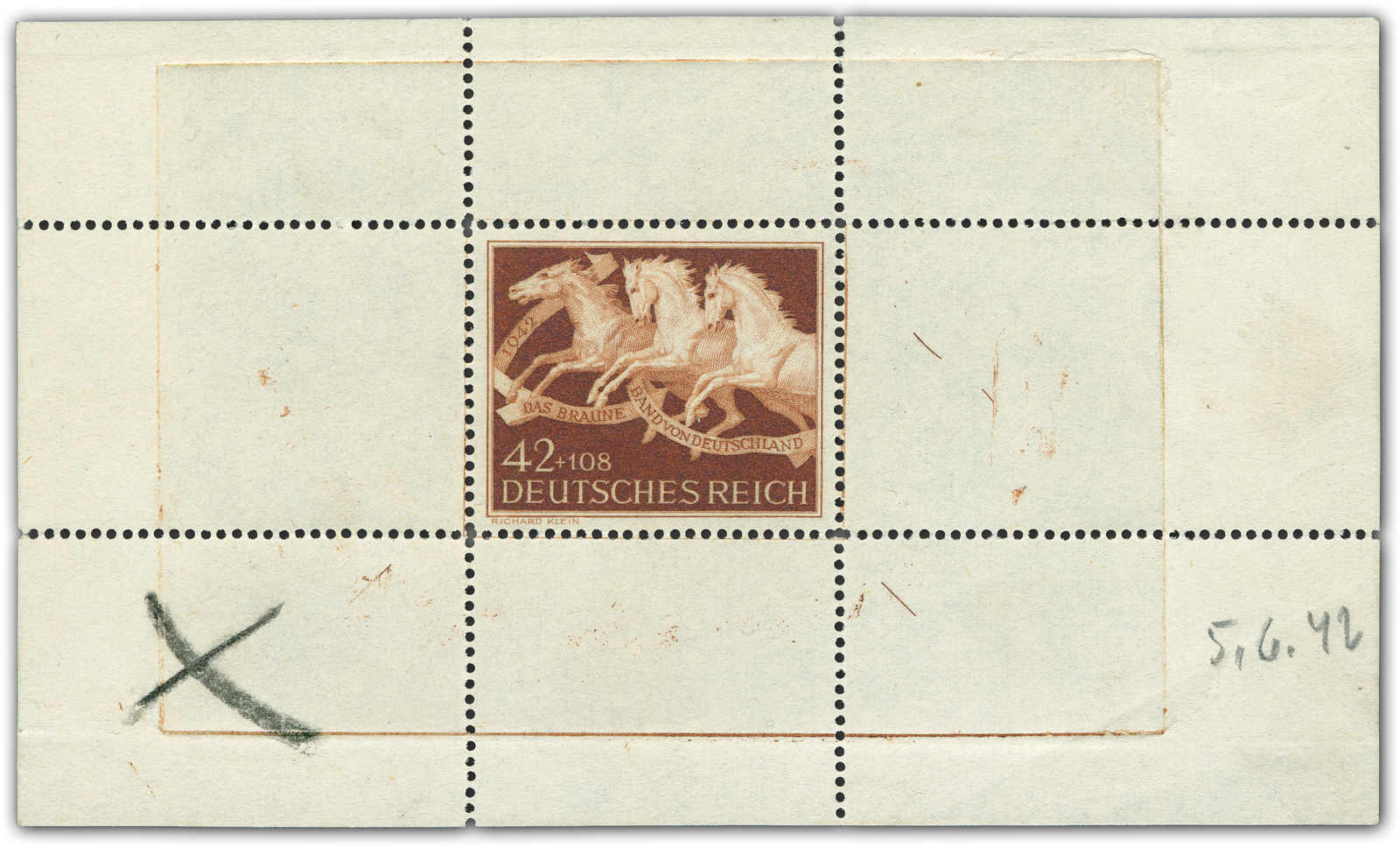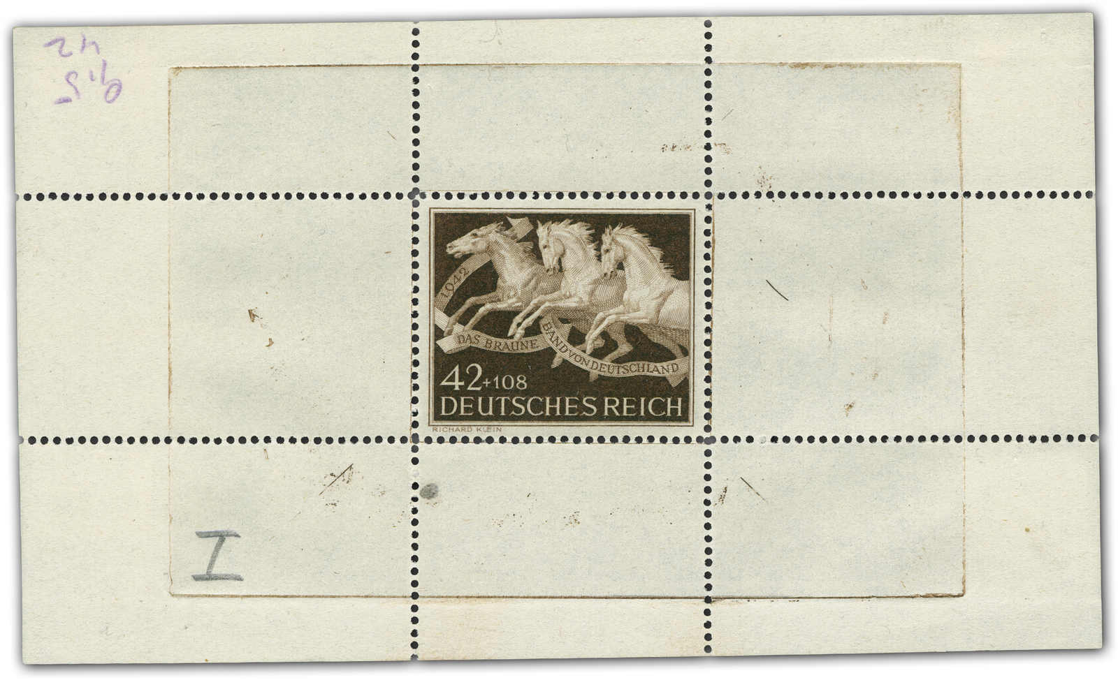 The Brown Ribbon 1942 Print taken from the original die. The miniature sheet of the 2nd version – perforated. At botteo left control cross in black. At right manuscript dateline 5.6.42. Corner crease and small tear in outer margin. (Image)