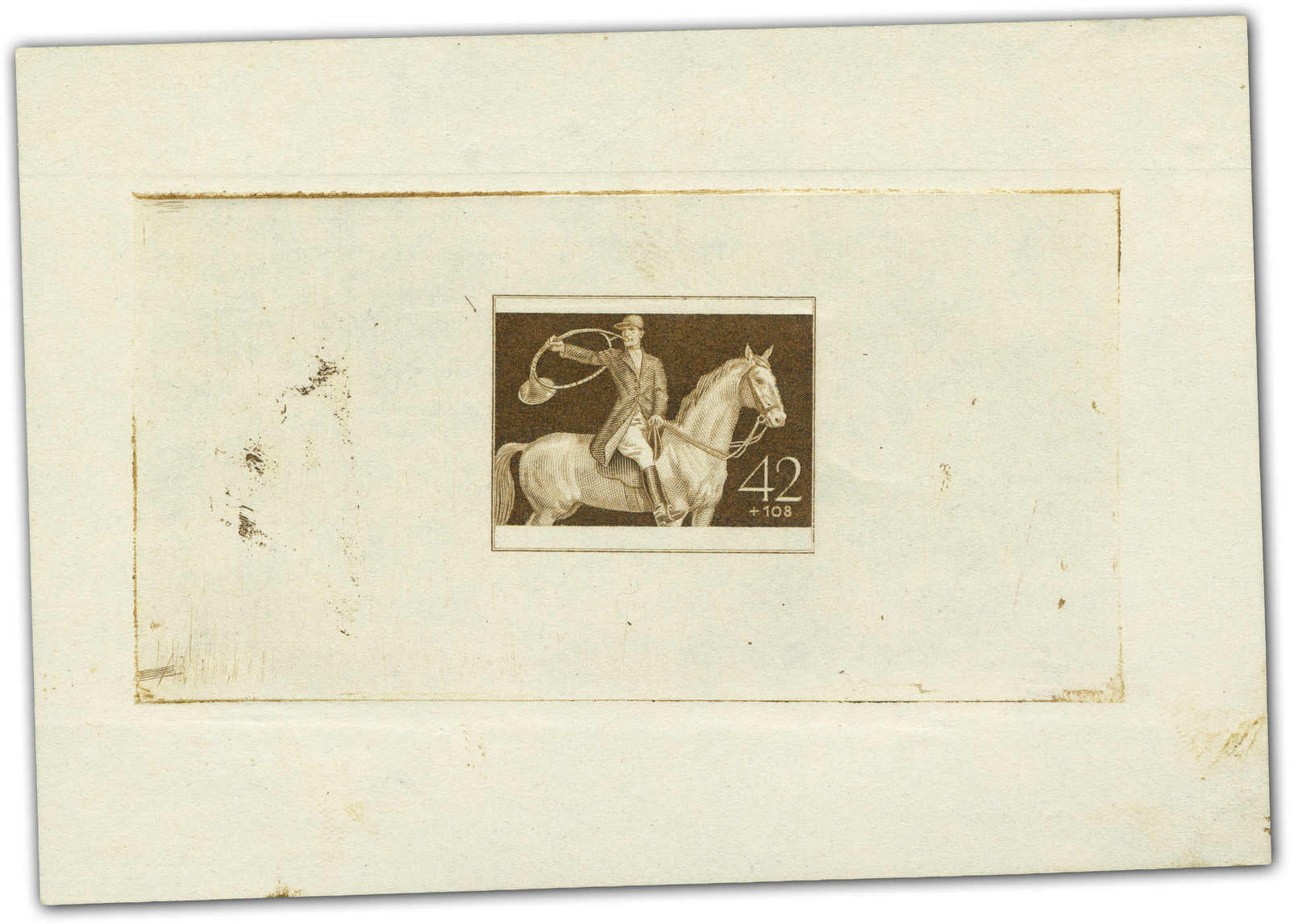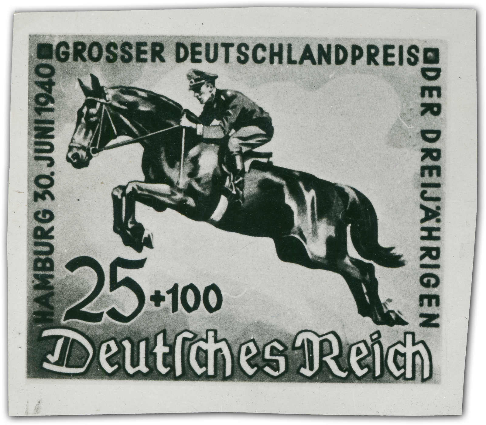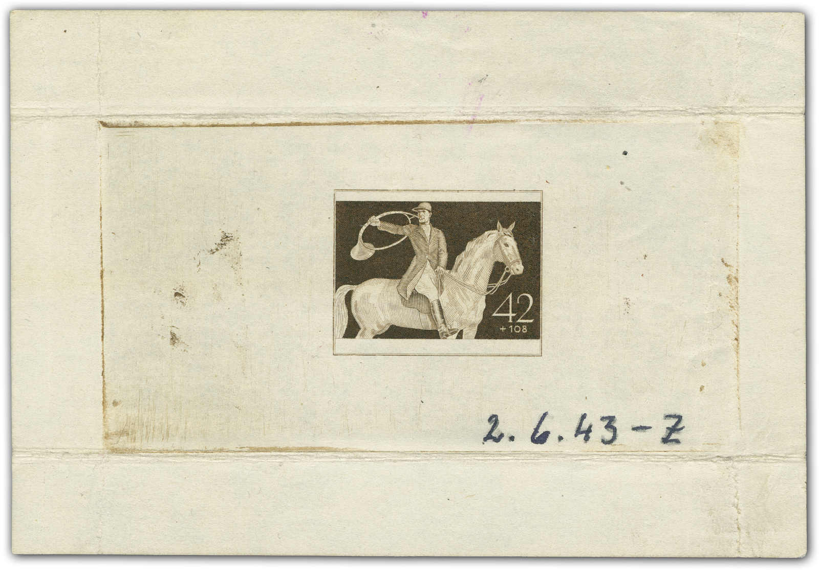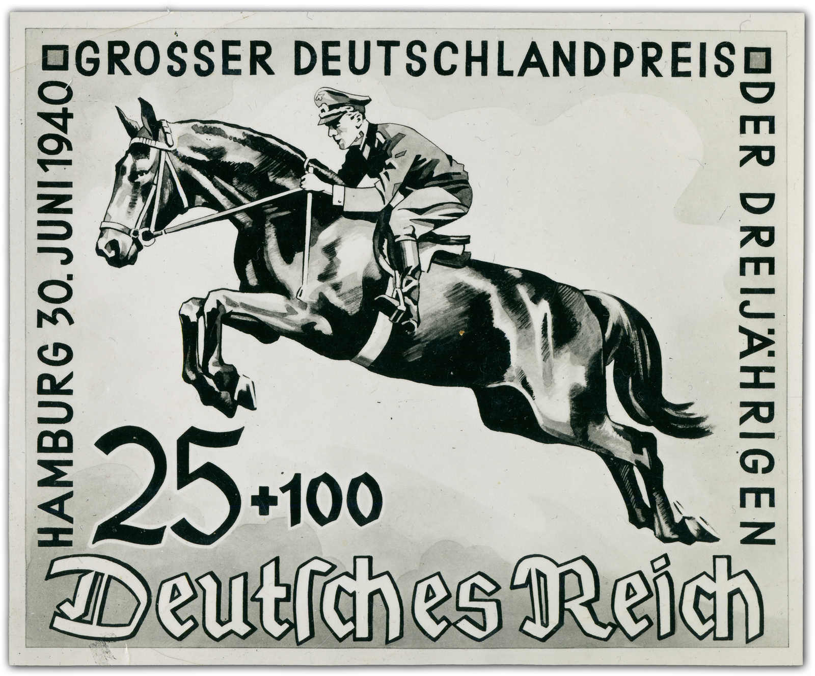 Major award of Germany for three-year old horses On the occasion of the “Blue Ribbon“ a commemorative stamp was issued for the first time in 1940. The motif was designed by the engraver E.Stahl. The first draft of the artist – which was