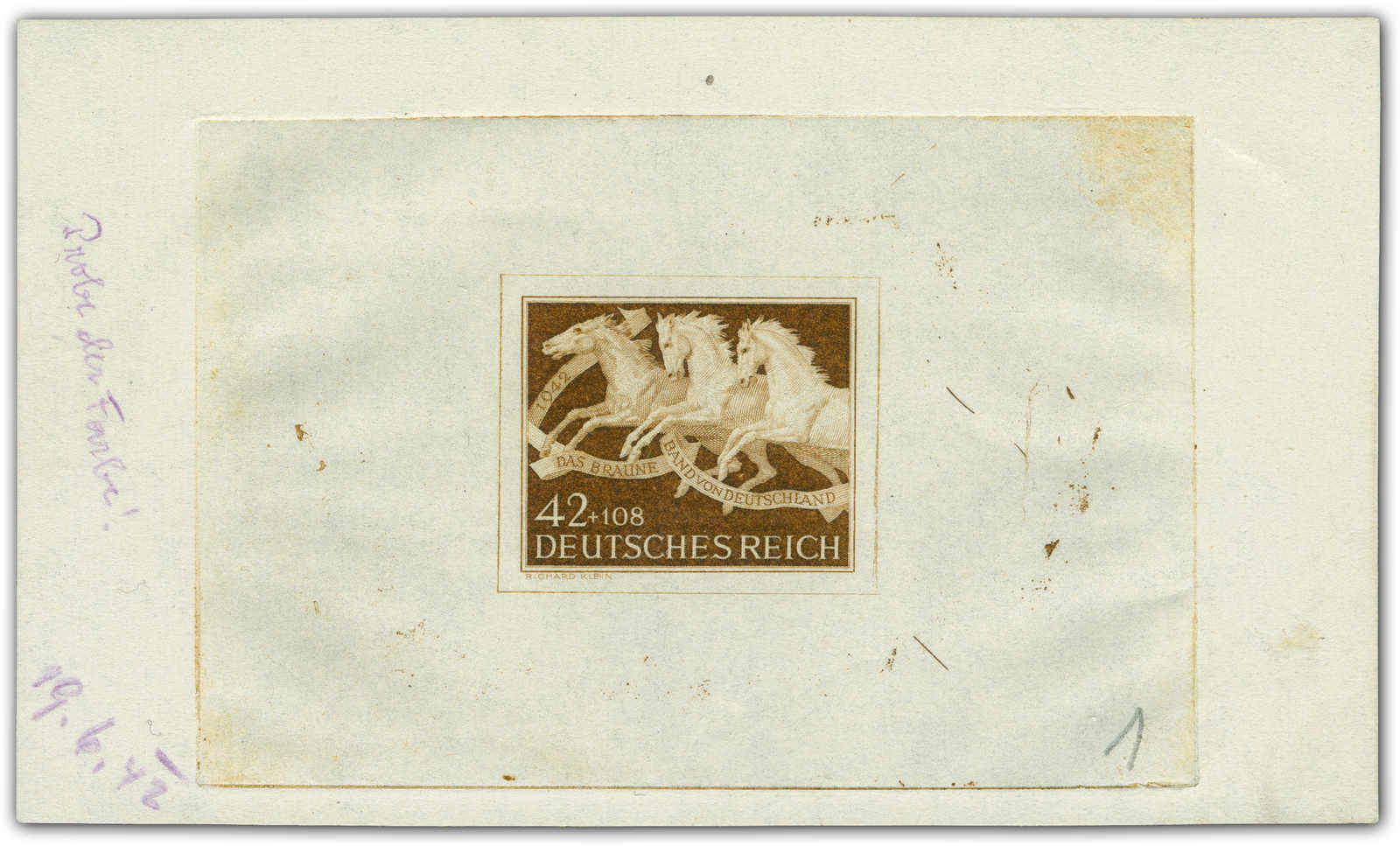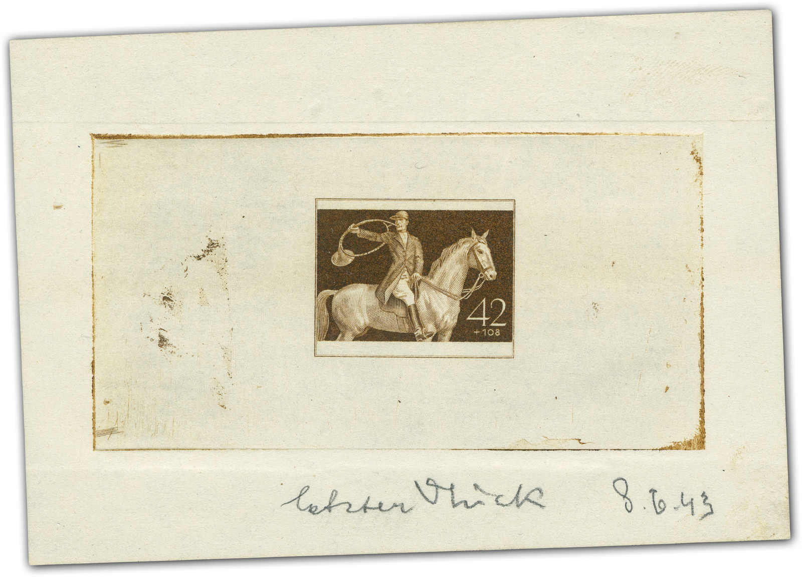 The Brown Ribbon 1943 Phase print which depicts the motif with the face value tablet. The inscriptions are still missing. At the top manuscript dating “2.6.43“ by the engraver with his short signature “Z“. (Image)
