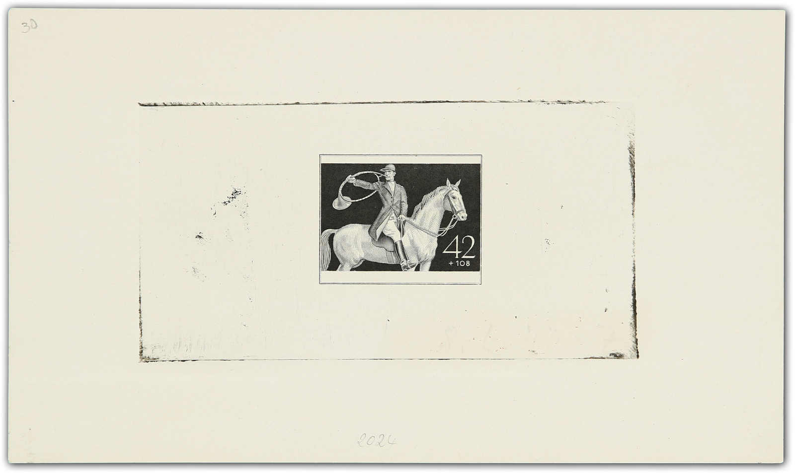 The Brown Ribbon 1943 Print from the steel original showing the final design. The print was executed in deep dark black on chalky paper. Prints on this kind of material showed a result of extremely high quality. The engraver used such