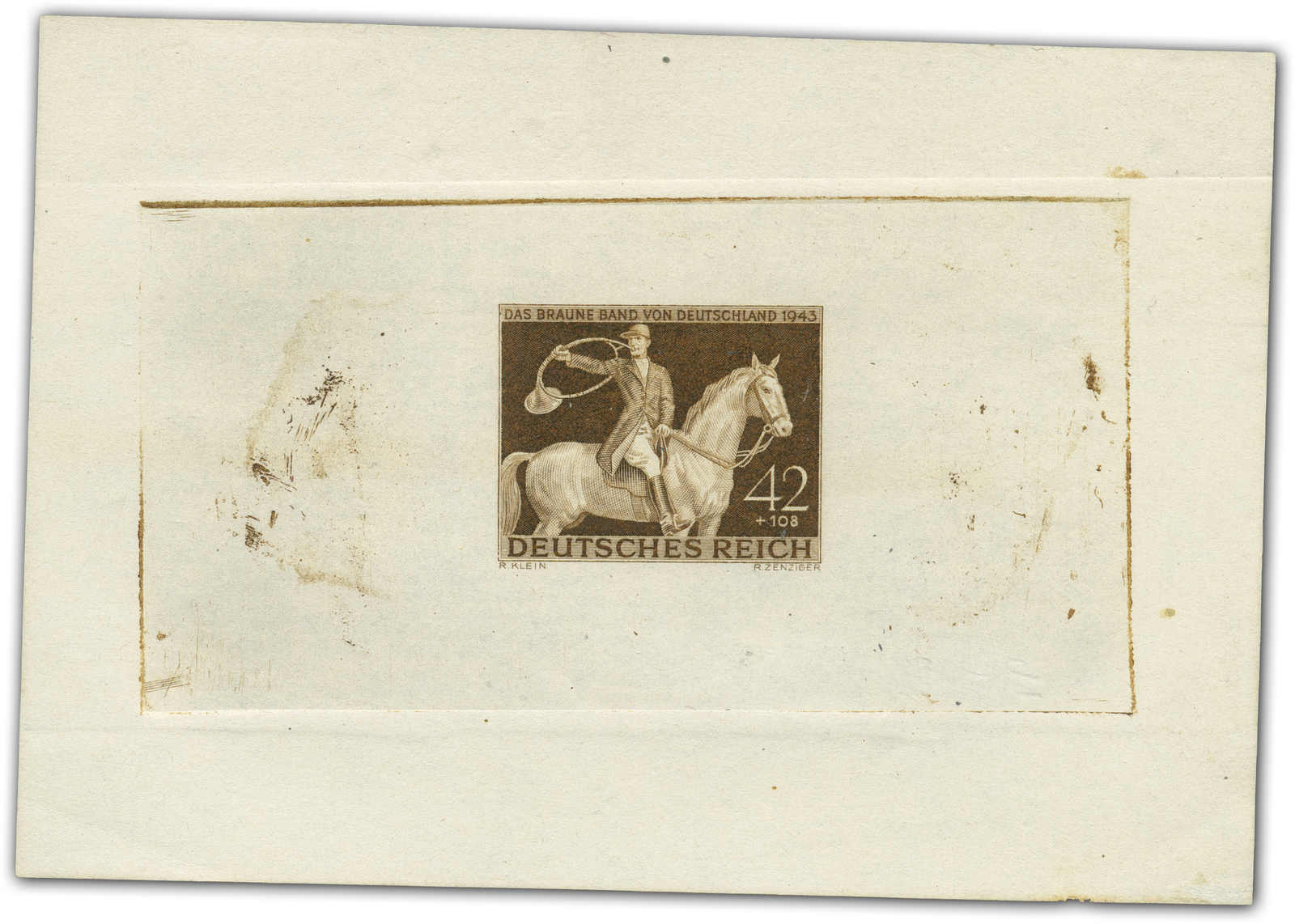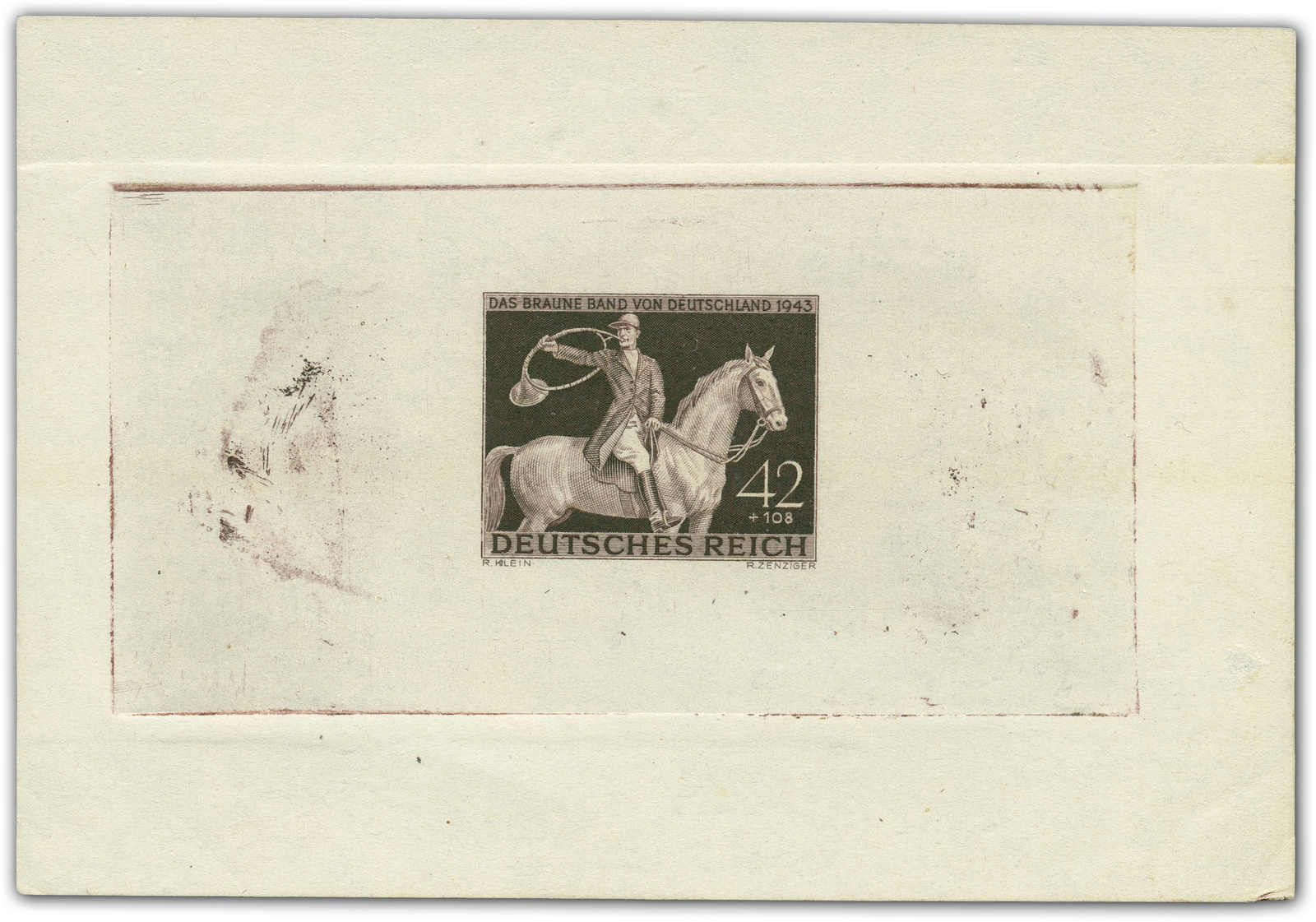 The Brown Ribbon 1943 A phase print as offered under lot 109 with the same dating and short signature 2.6.43 – Z, vertically and horizontally folded outside the stamp design. (Image)