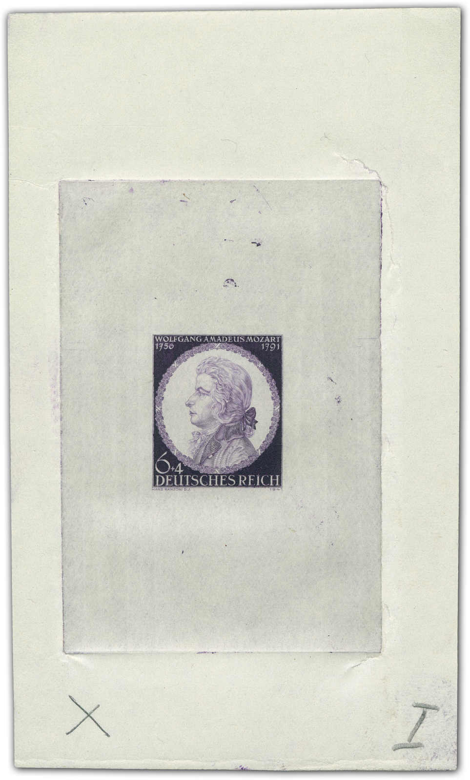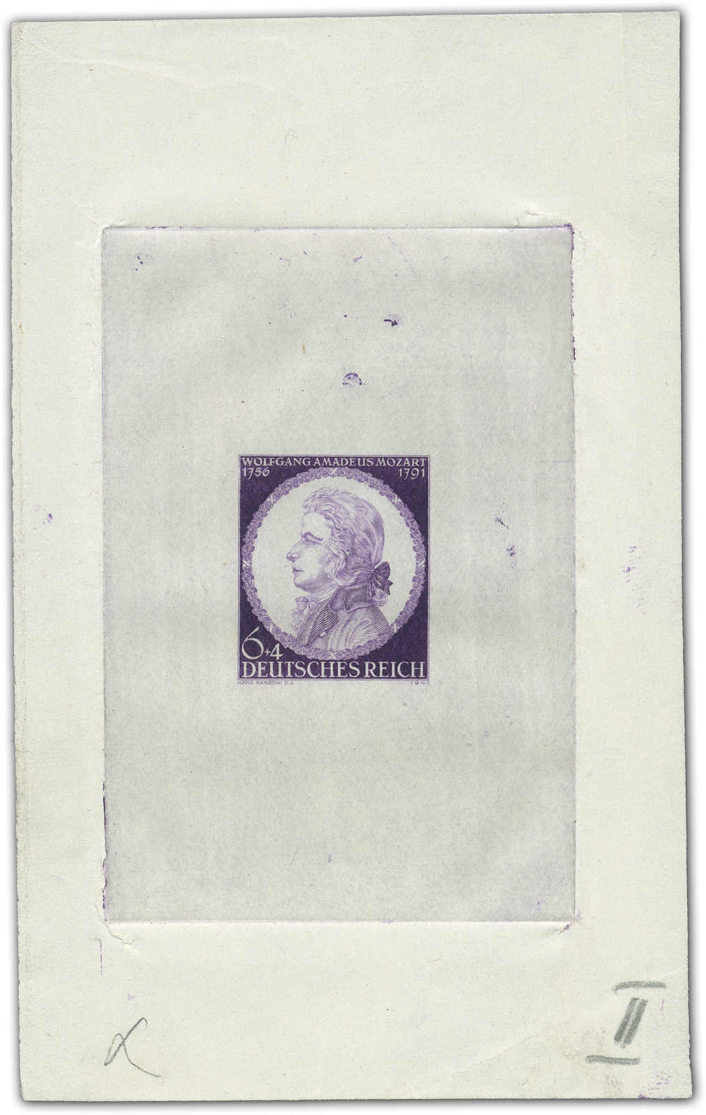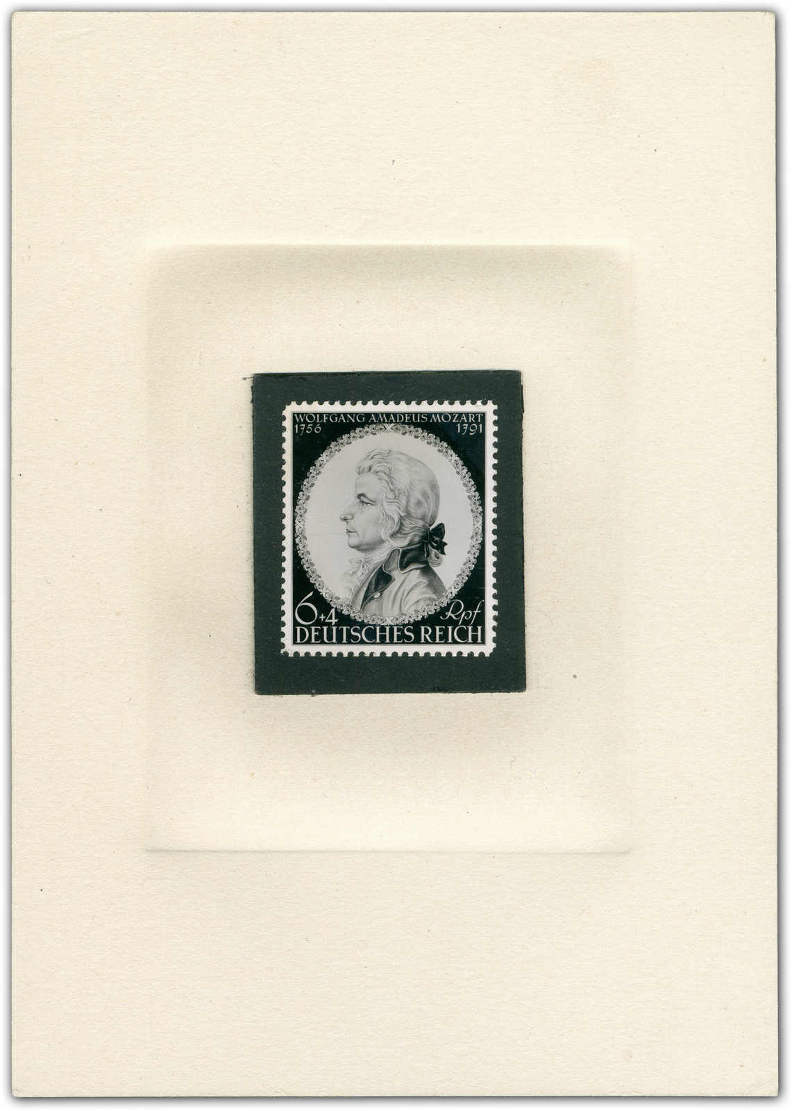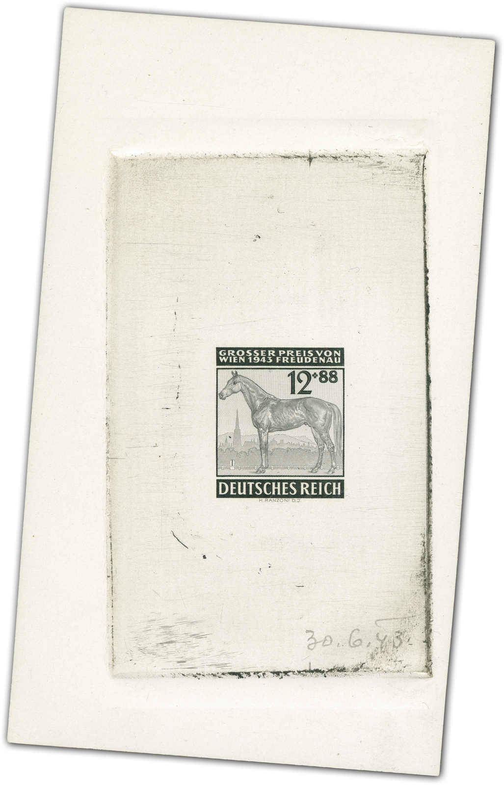 Major prize of Vienna 1944 The “12+88“ value showing the motif reduced to stamp size and mounted on a presentation card. At bottom the embossed seal of the “Staatsdruckerei“ Vienna. The pre-production department printed a couple of these