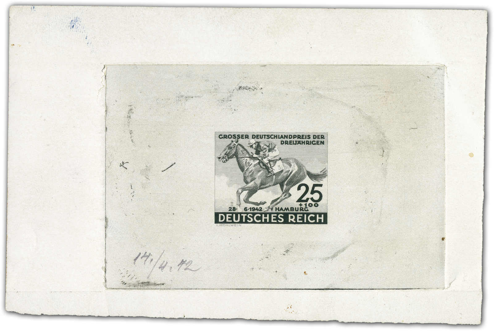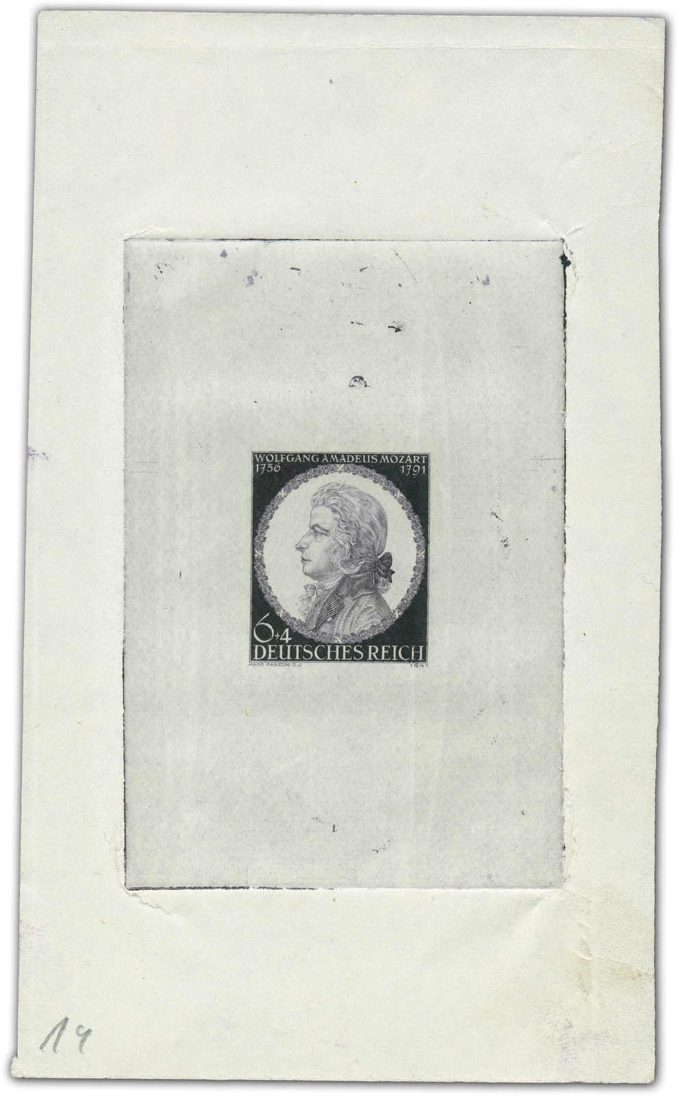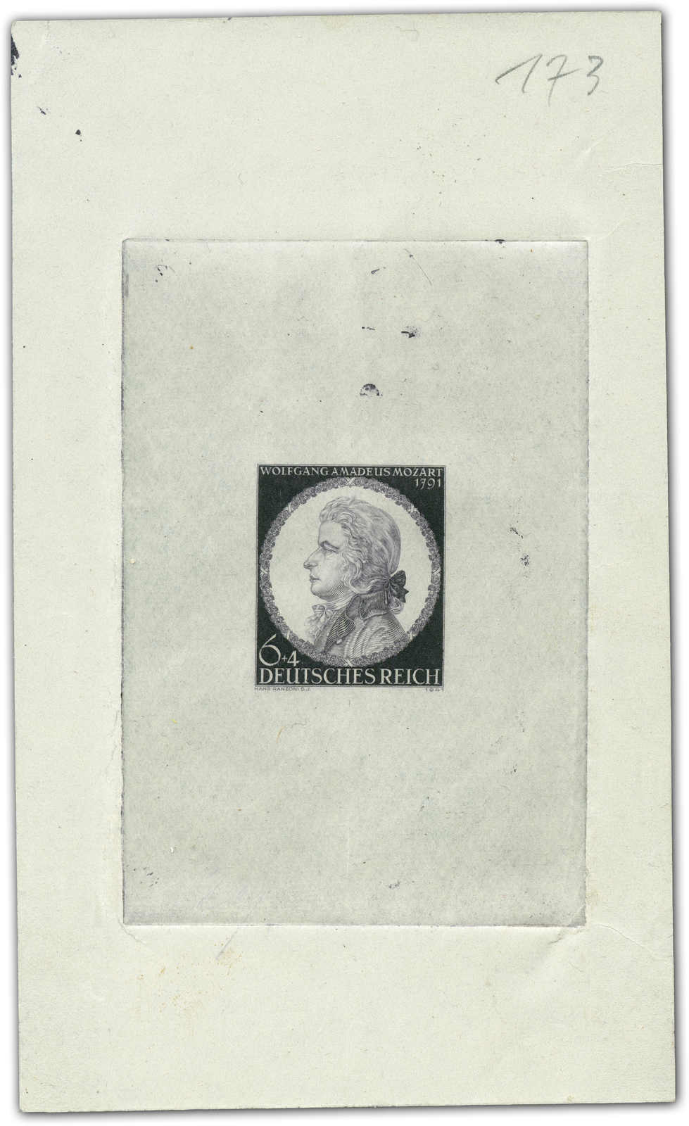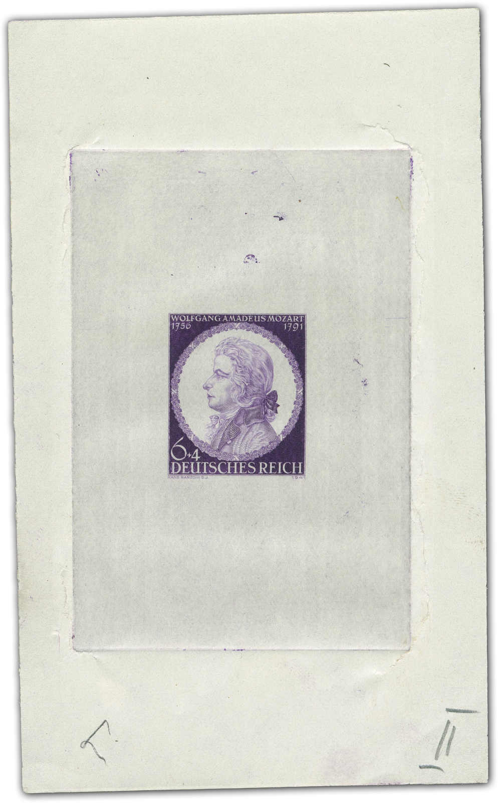 Major prize of Vienna 1944 The “12+88“ value showing the motif reduced to stamp size and mounted on a presentation card. At bottom the embossed seal of the “Staatsdruckerei“ Vienna. The pre-production department printed a couple of these