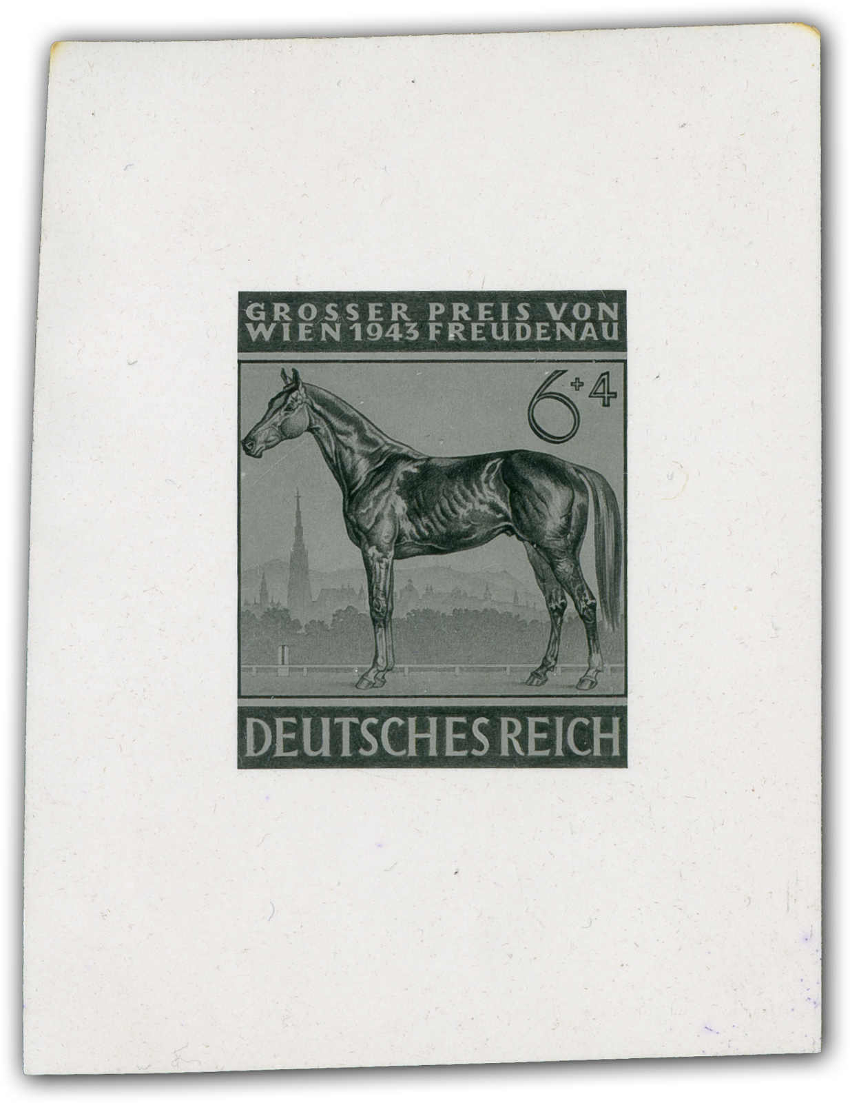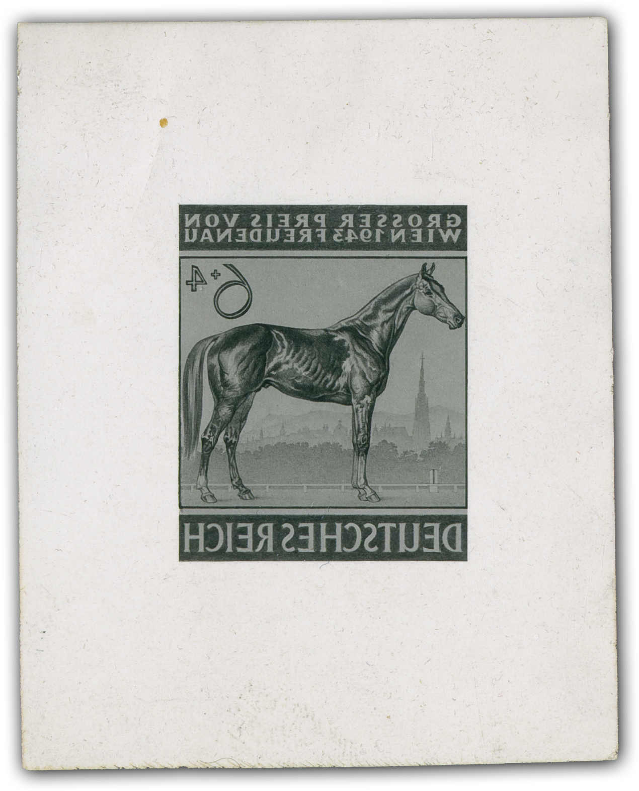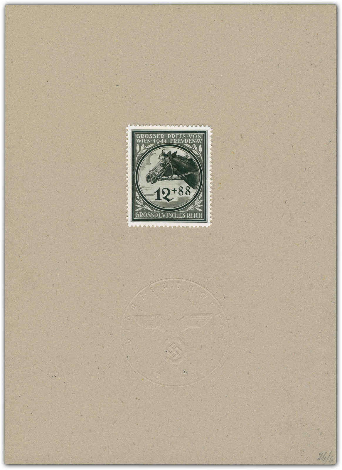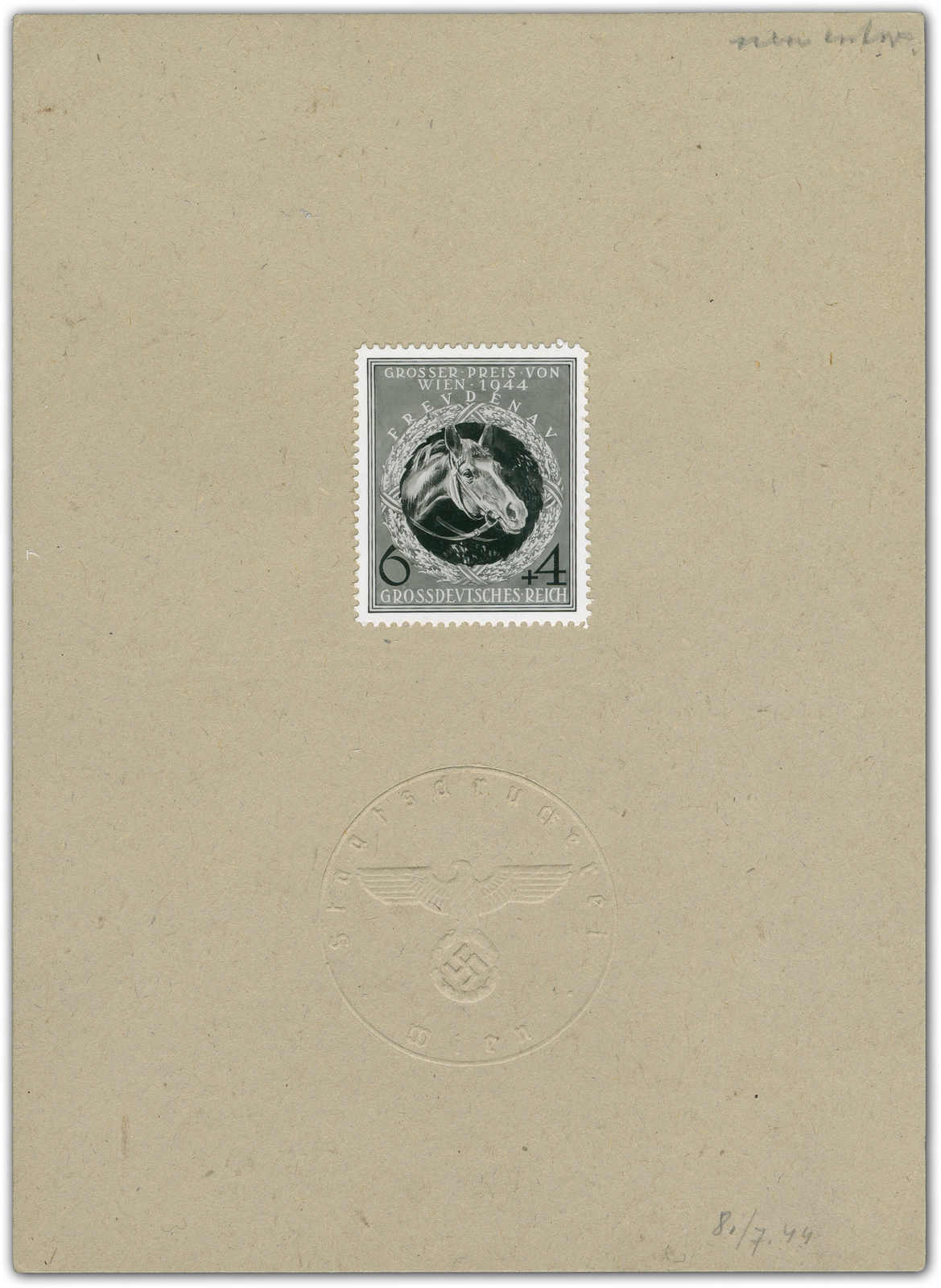 Major prize of Vienna 1944 Single print of the “6+4“ value on an official presentation card showing the embossed seal of the “Staatsdruckerei“ Vienna. According to a note found in the estate of Dr. Stefan Fischer (Vienna) the printer in