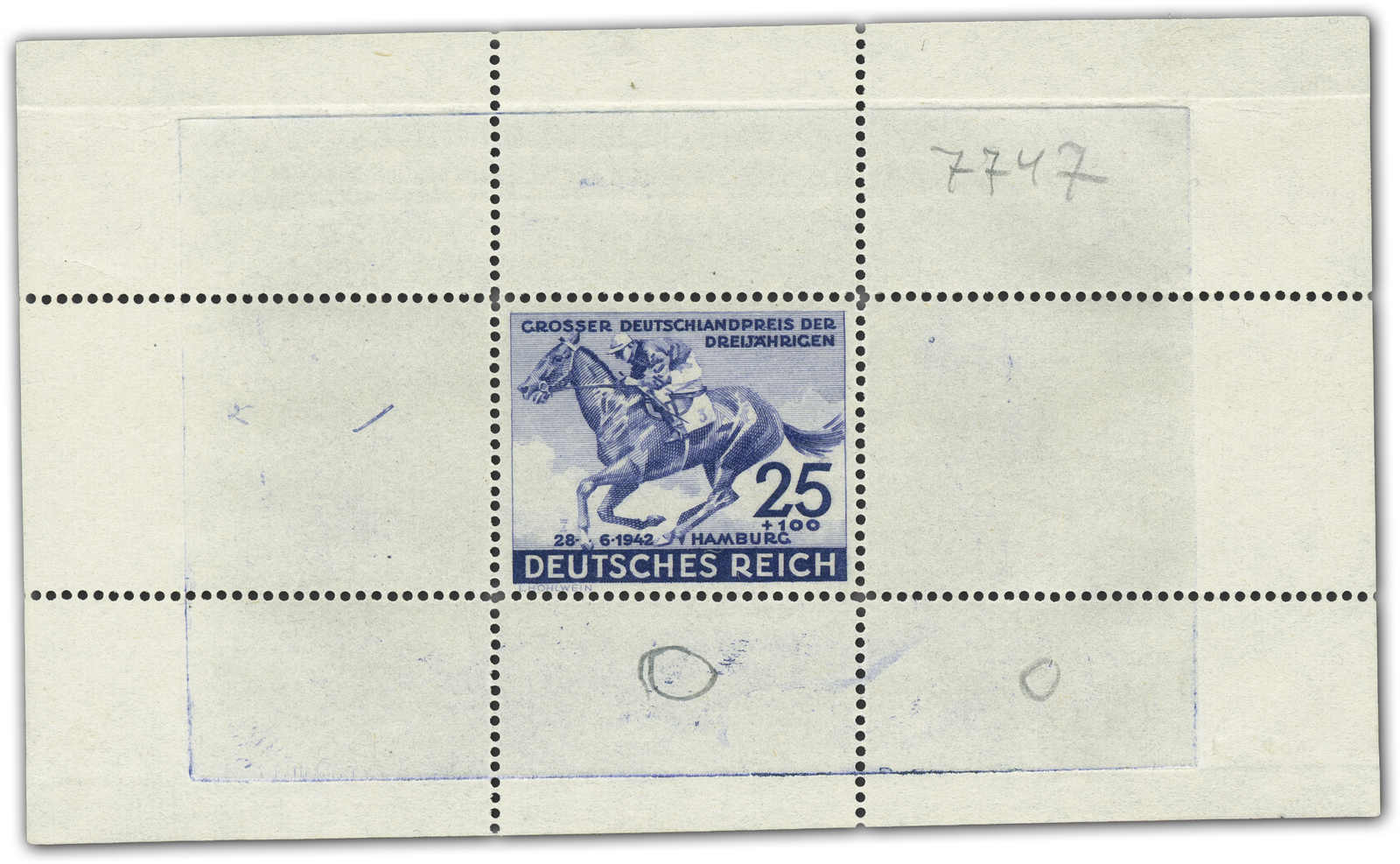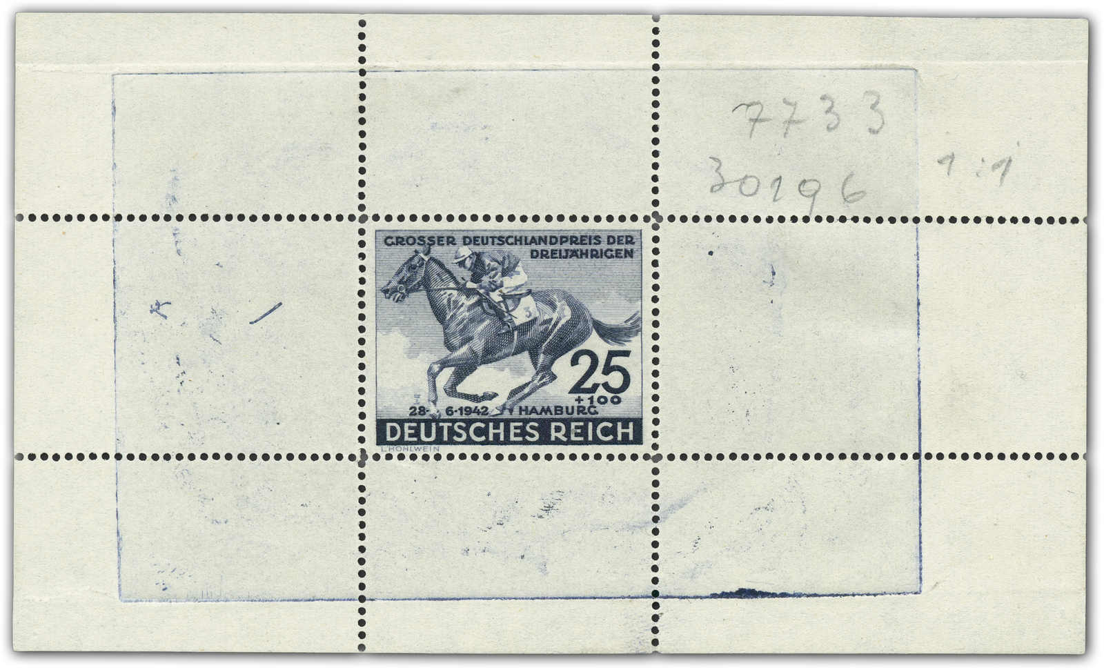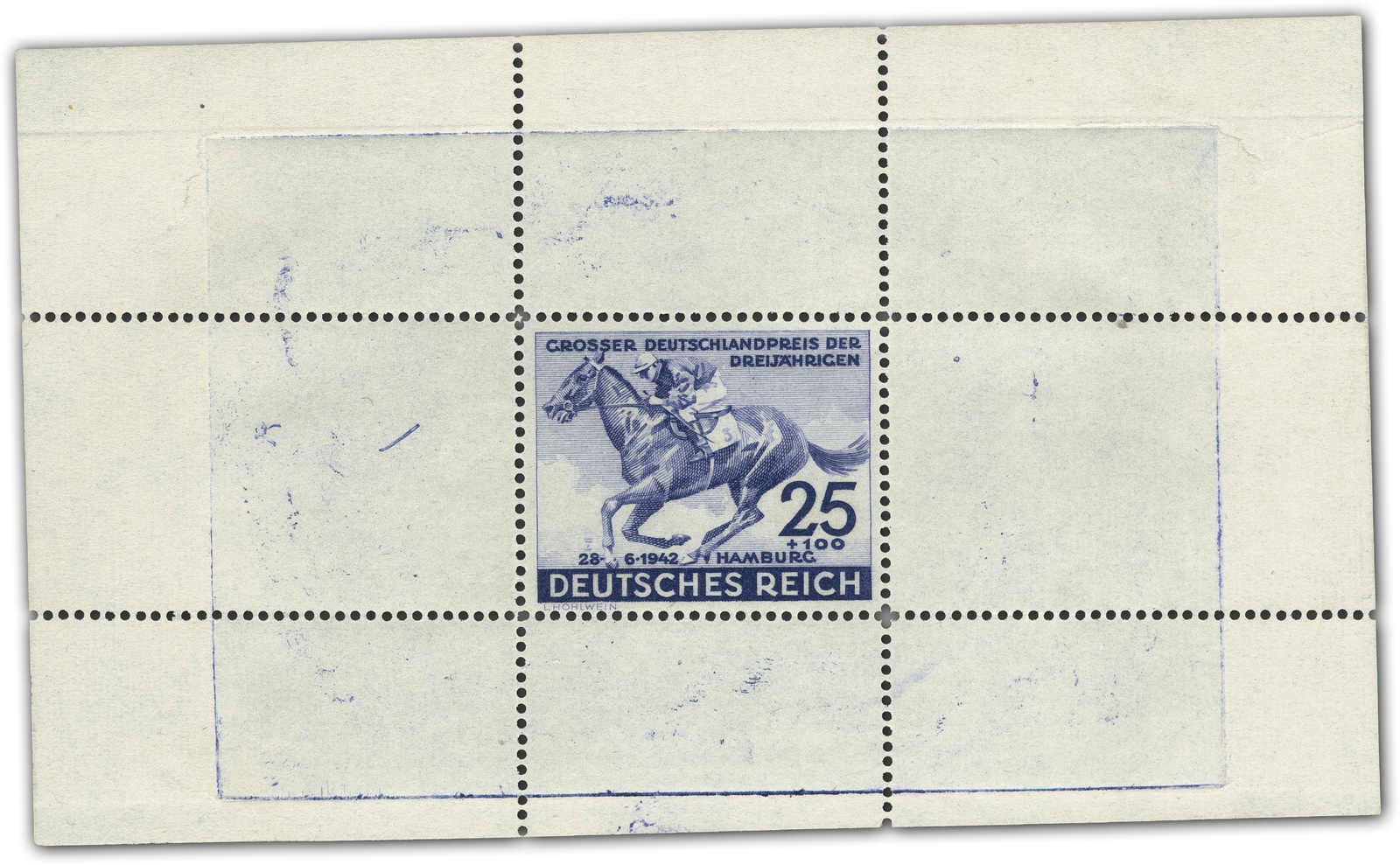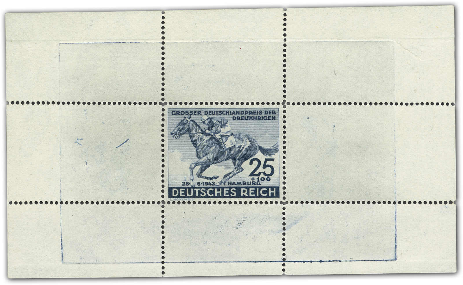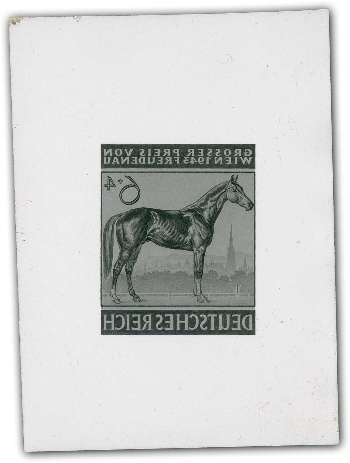 Major prize of Vienna 1944 Single print of the “6+4“ value on an official presentation card showing the embossed seal of the “Staatsdruckerei“ Vienna. According to a note found in the estate of Dr. Stefan Fischer (Vienna) the printer in