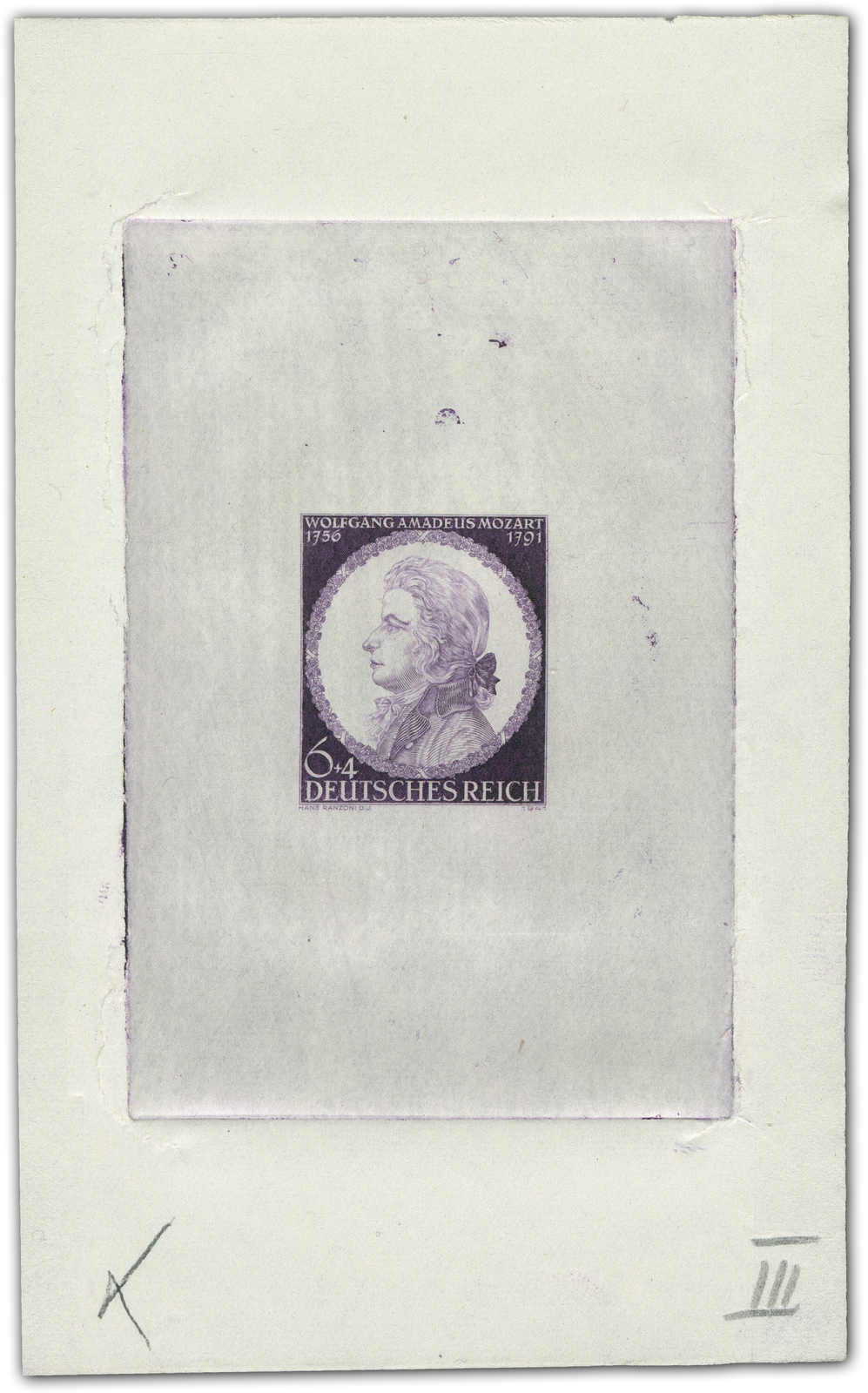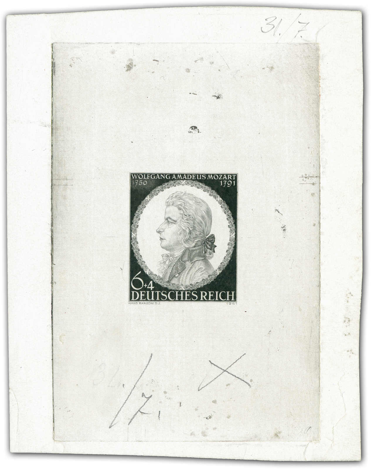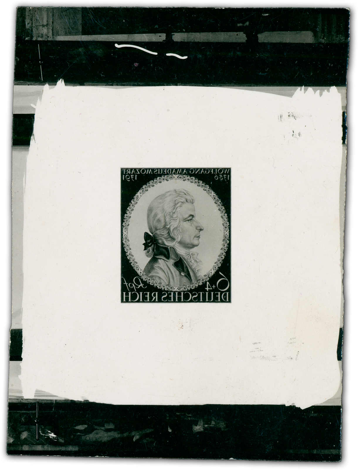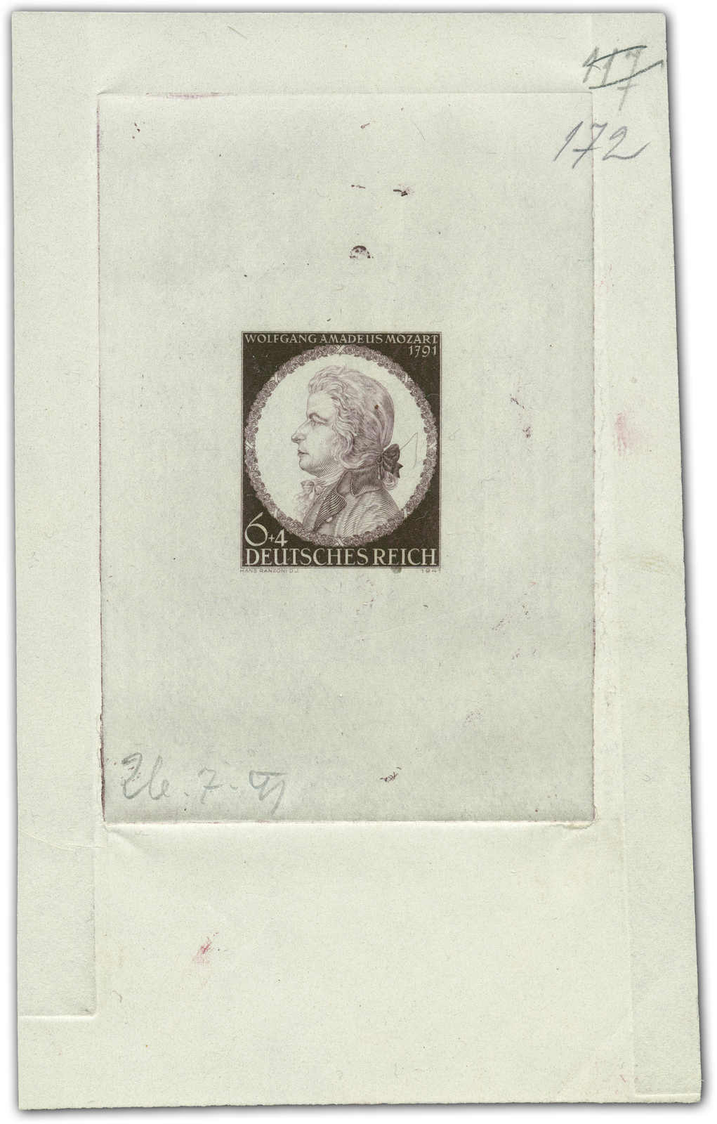 Print taken from the original die in “broken black“. In the margin at top, handwritten dateline “31./7.“ and the “X“ initial of the steel printer. This ist he darkest nuance of all Mozart prints. (Image)