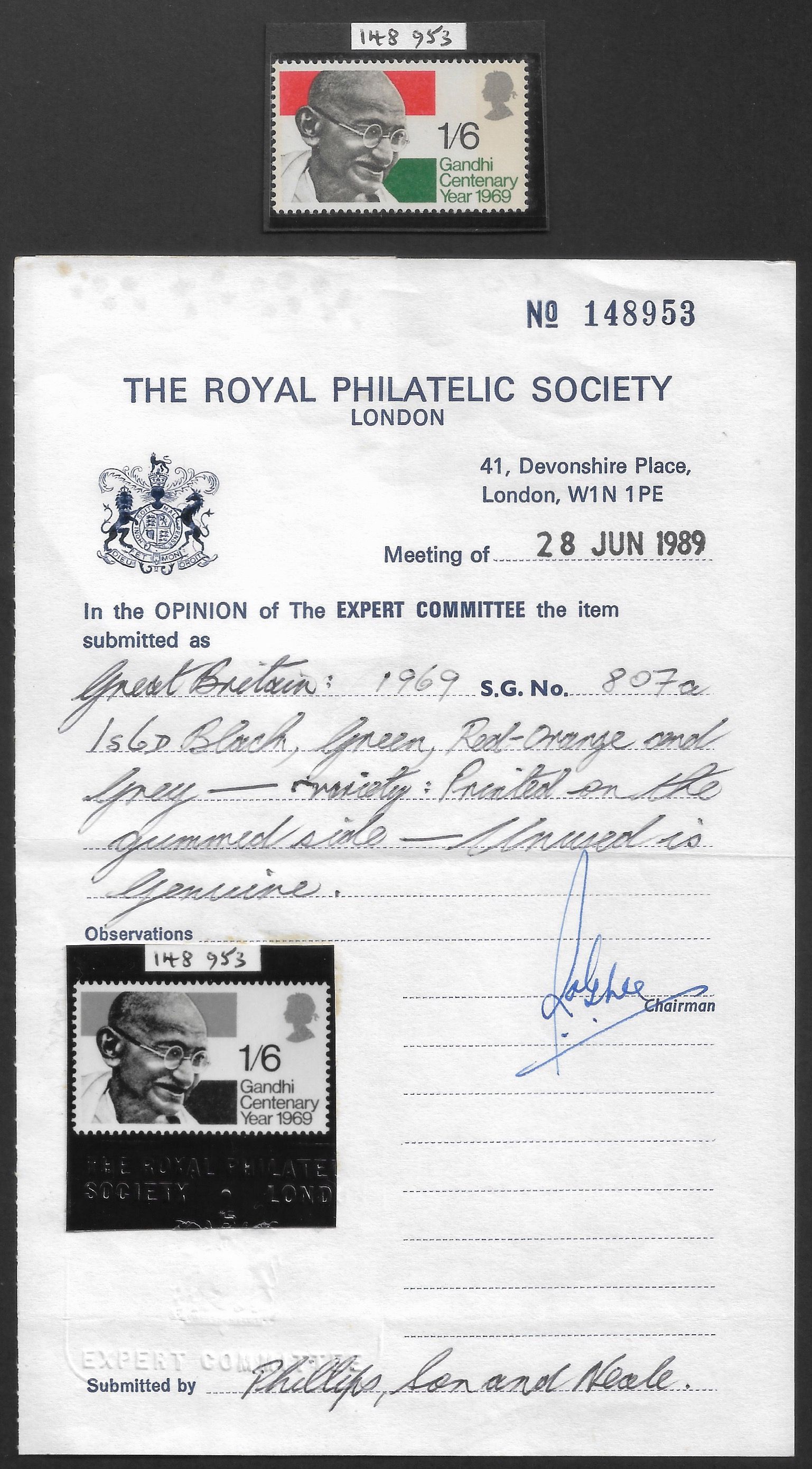 GB 1969 stamp on India Gandhi with RARE error - Printed on gum side MNH stamp - RPS Cert.(Image 1)