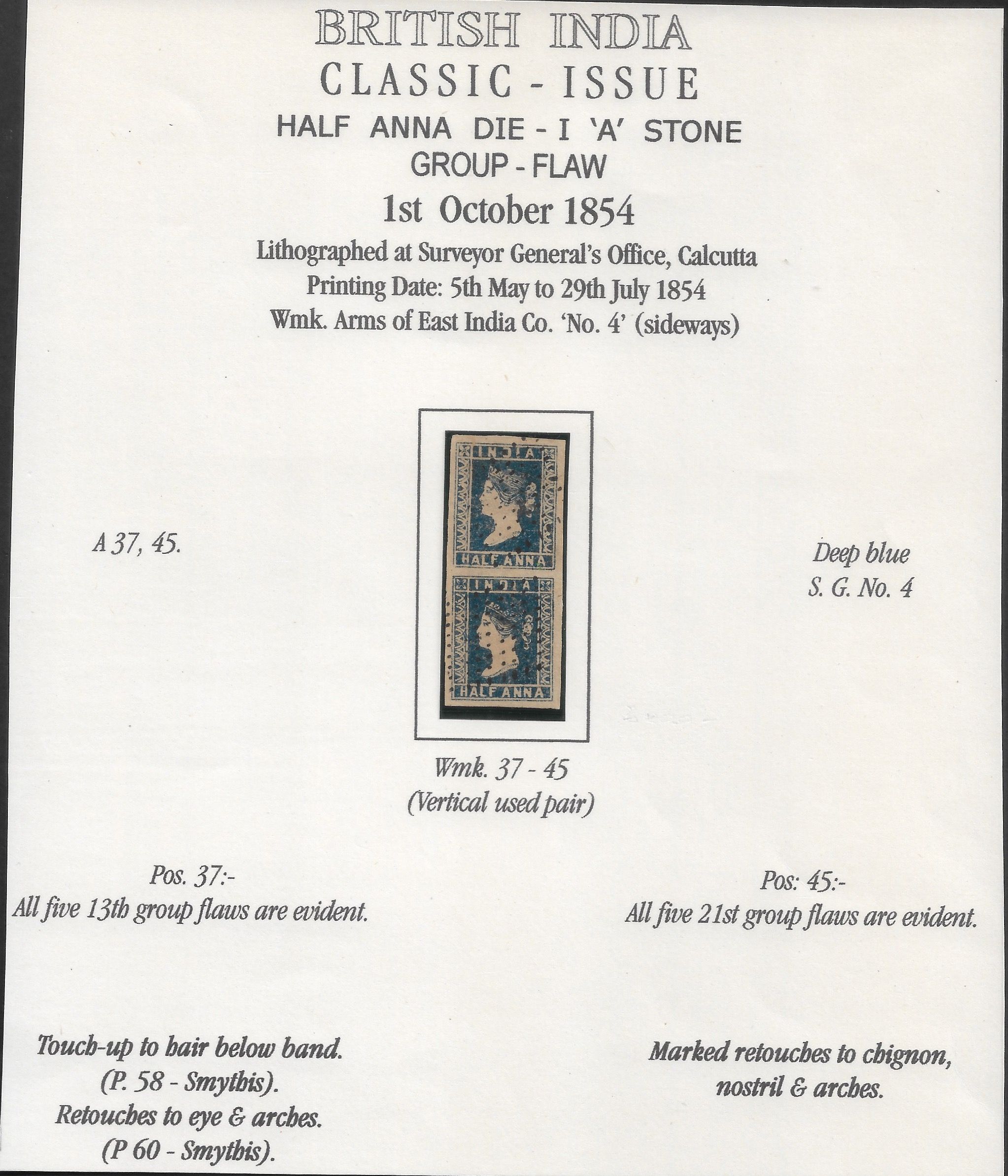 India 1854 1/2a Lithograph used vertical pair (Pos. 37/45), Die I, "A" Stone showing the Group flaws - Ex. Eric