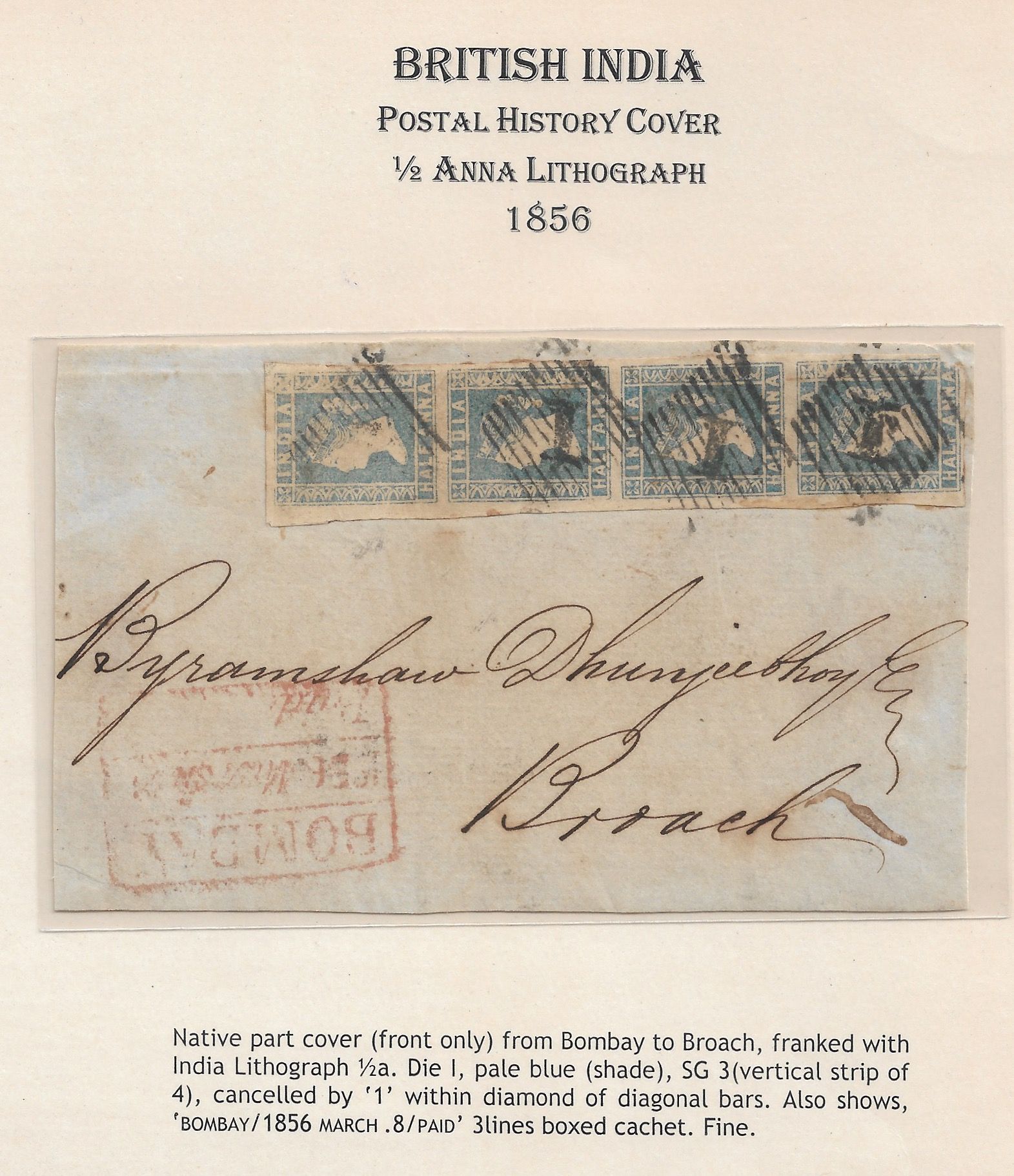 India 1854 1/2a Lithograph used vertical used strip of 4 (RARELY seen), Die I, SG3, on cover front from Bombay