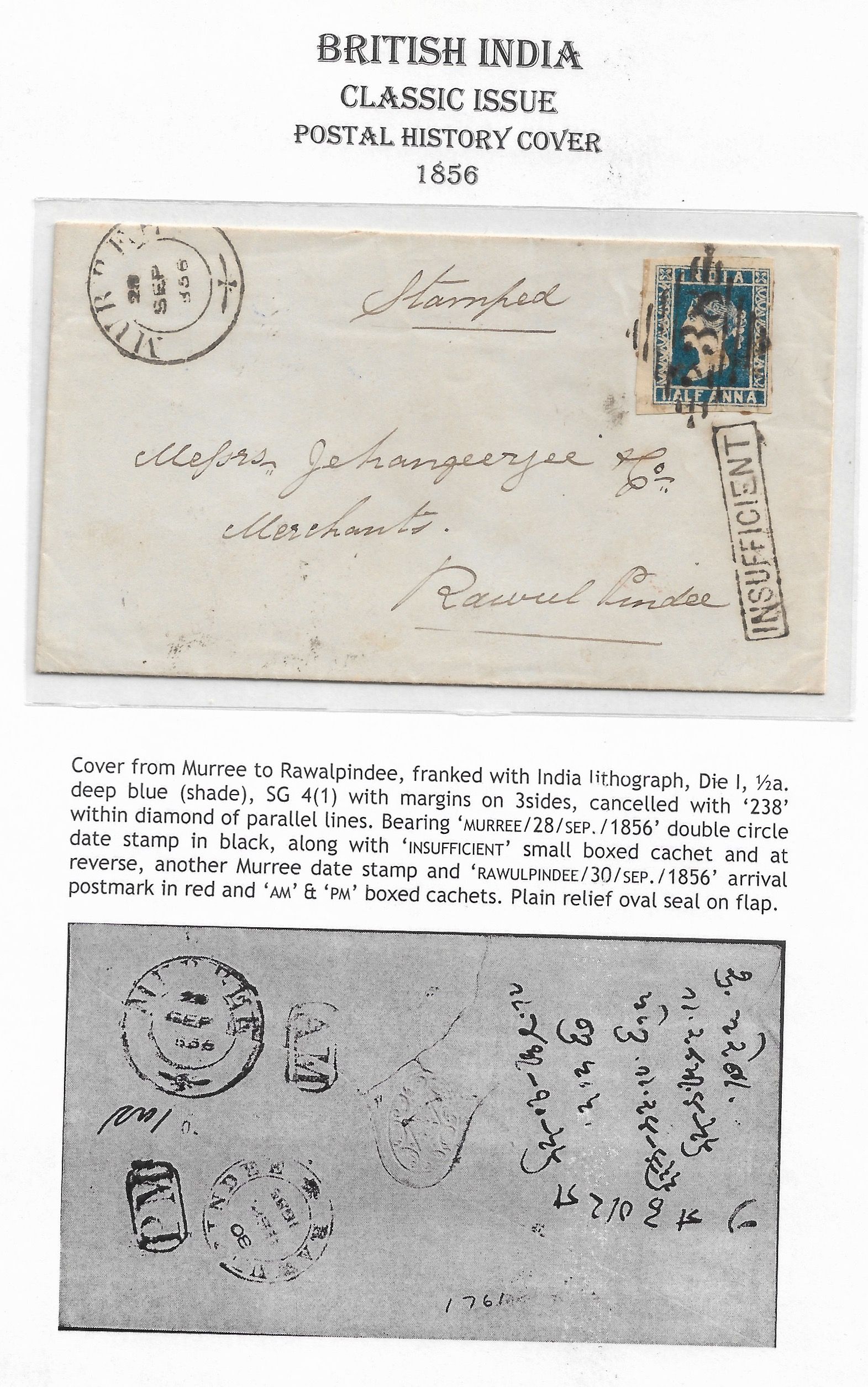 India 1854 1/2a Lithograph, Die I, SG 4, EXCEPTIONAL cover sent from from Murree to Rawalpindee, with VERY RARE