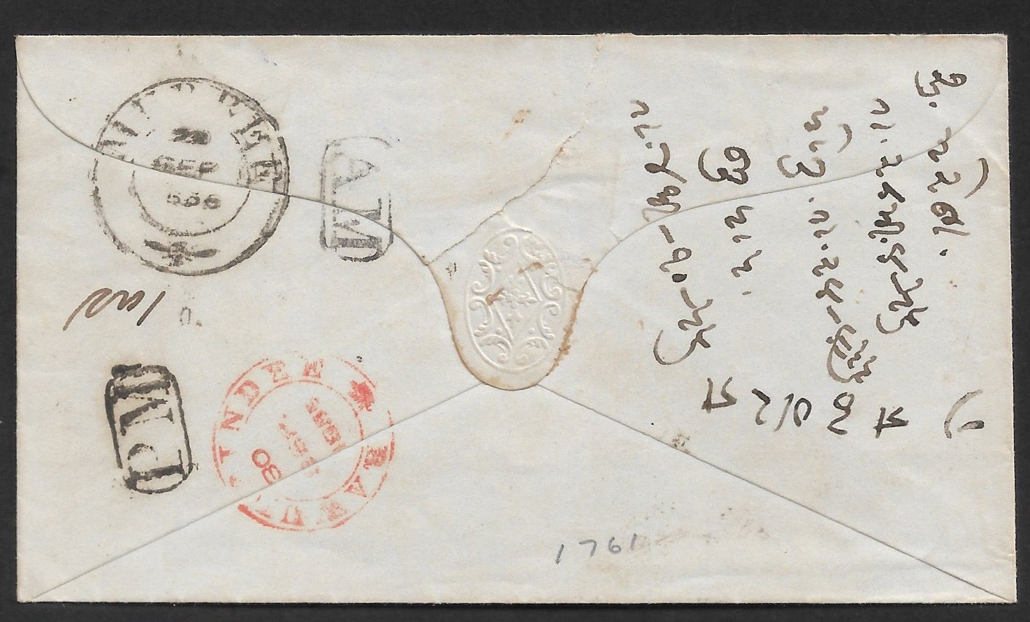 India 1856 QV ½a on cover cancelled with "176" within diamond of bars from Lucknow to Pegu Burma(Image 1)