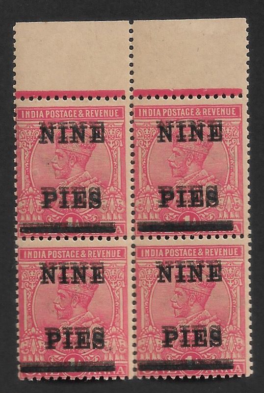 India 1911 KGV EXCEPTIONAL ERROR "NINE PIES" surcharge doubly printed on marginal MNH block of 4, SG 192c, CV £1200