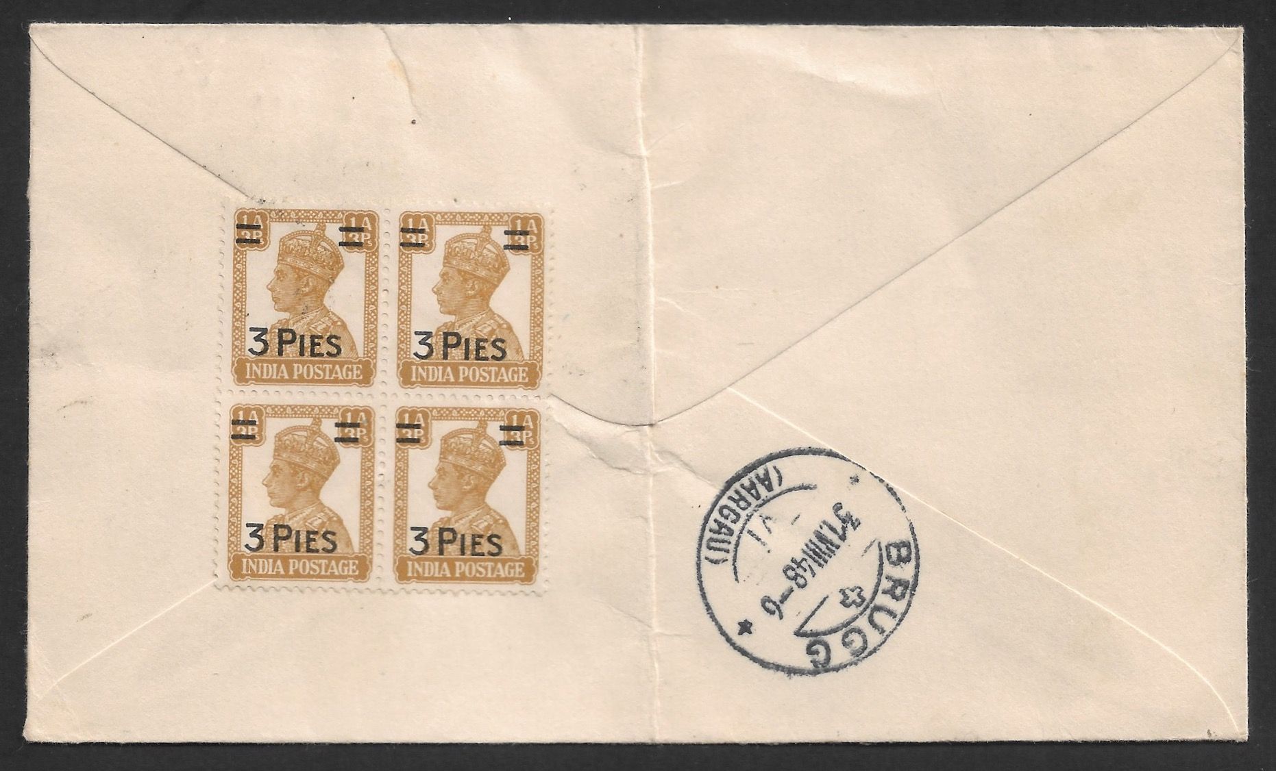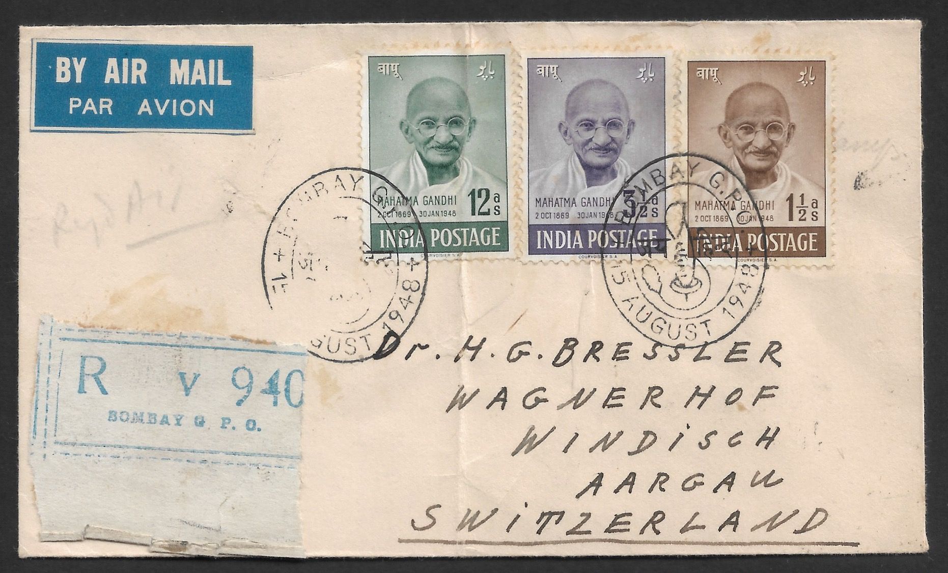 India 15th August 1948 3v Gandhi Registered cover from Bombay to Aargau Switzerland with surcharged KGVI 3p