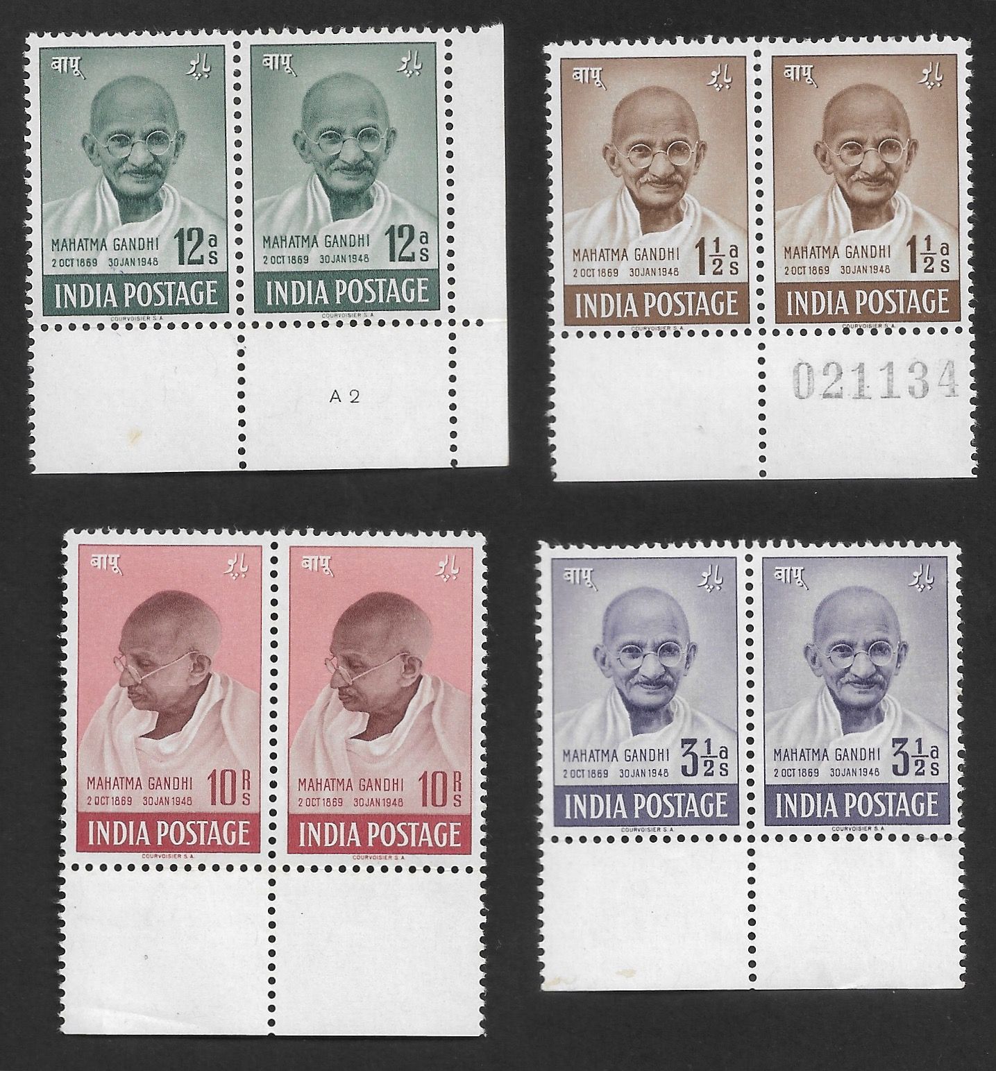 India 1948 SG 305-308, Gandhi, Exceptional marginal set of 4v in pairs(Image 1)