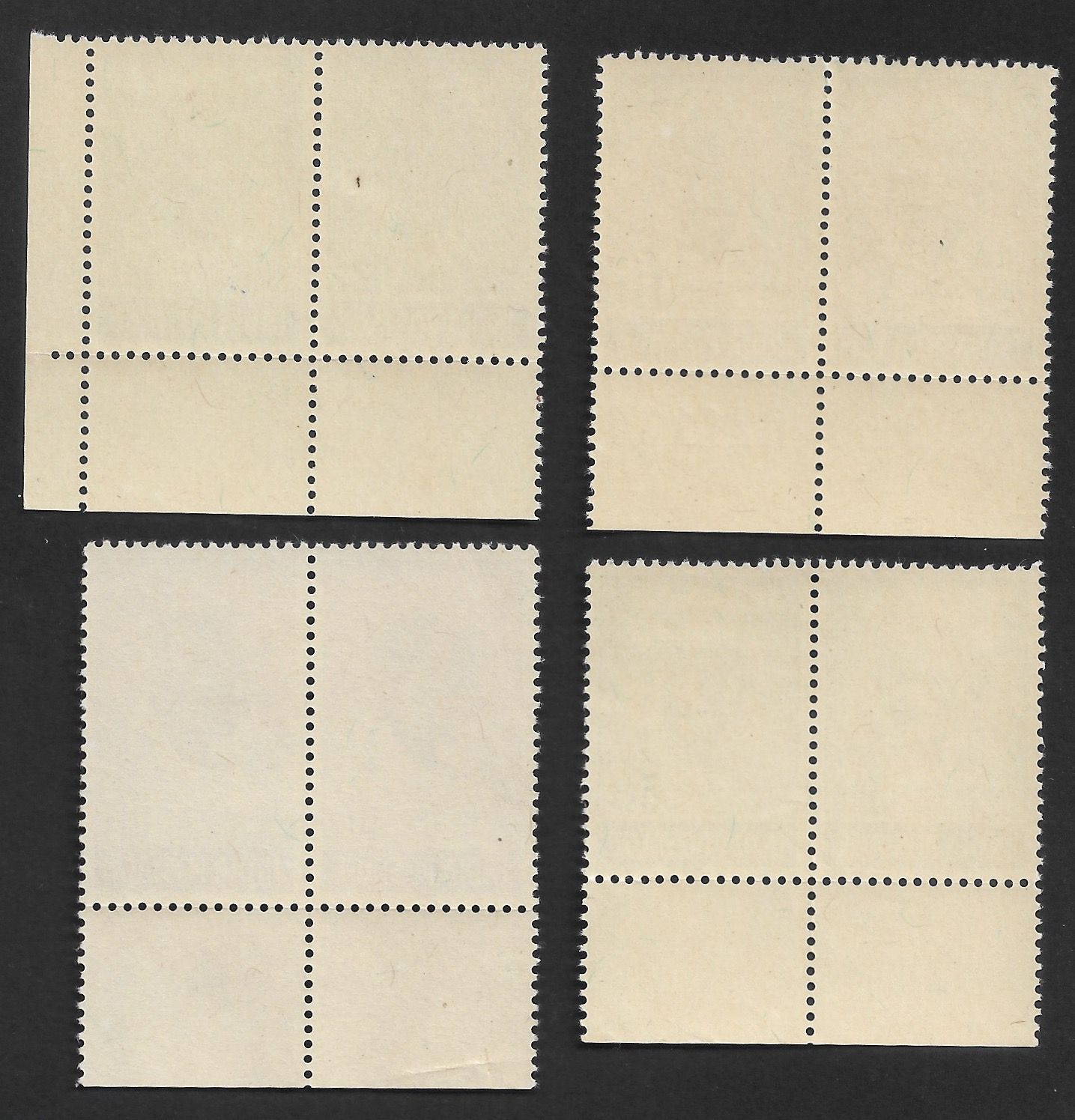 India 1946 KGVI Victory 9p green, 1½as violet, 3½as blue & 12as red, 4 corner blocks of 32 MNH stamps, SG 278-81, CV