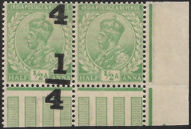 India 1922 1/4a EXCEPTIONAL corner positional horizontal pair showing the remarkable error w/ surcharge omitted on