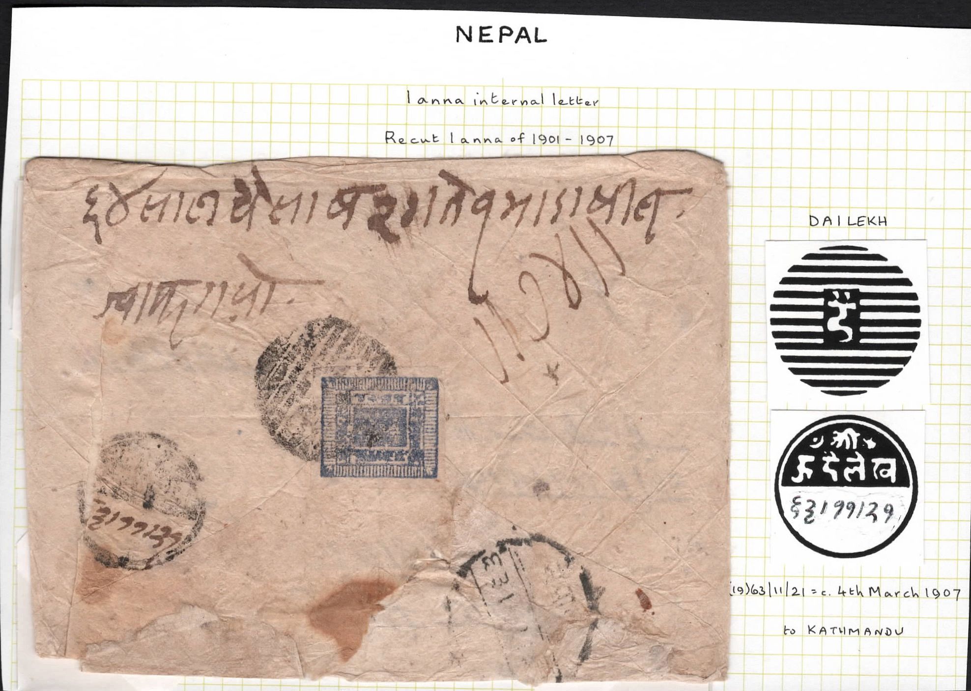 7118 imageNepal 1907 1a Classic issue recut variety from DAILEKH (Rare PO) to Kathmandu(Image 1) (Image 2)