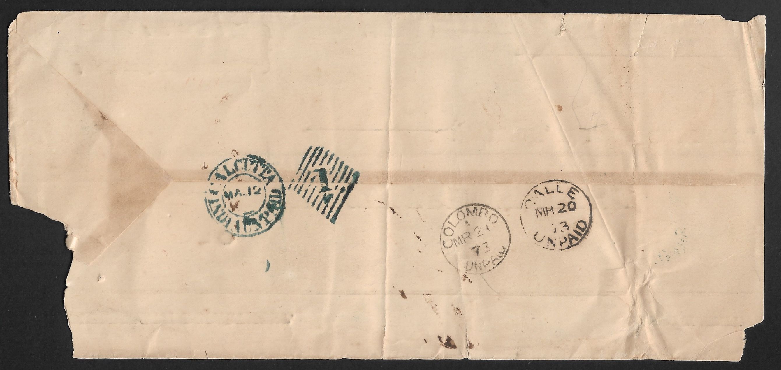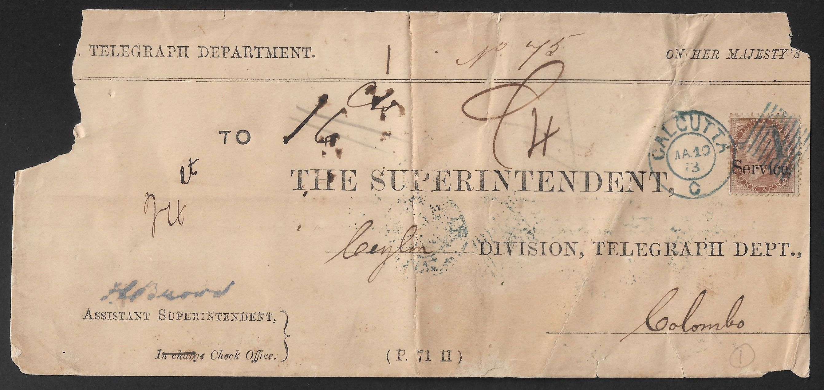India 1873 Official "On Her Majesty's" cover from the Telegraph Dept at Calcutta, signed by the Assistant