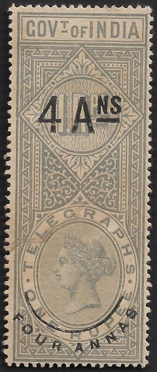 India 1904 Telegraph unused Stamp, "4 Ans" surcharge on QV 1R, SG #T68, CV £24(Image 1)