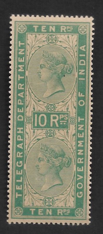 India 1878 QV Very Rare 10R unused Telegraph Stamp, Dull blue-green, Die II, SG £T14, CV £1200(Image 1)