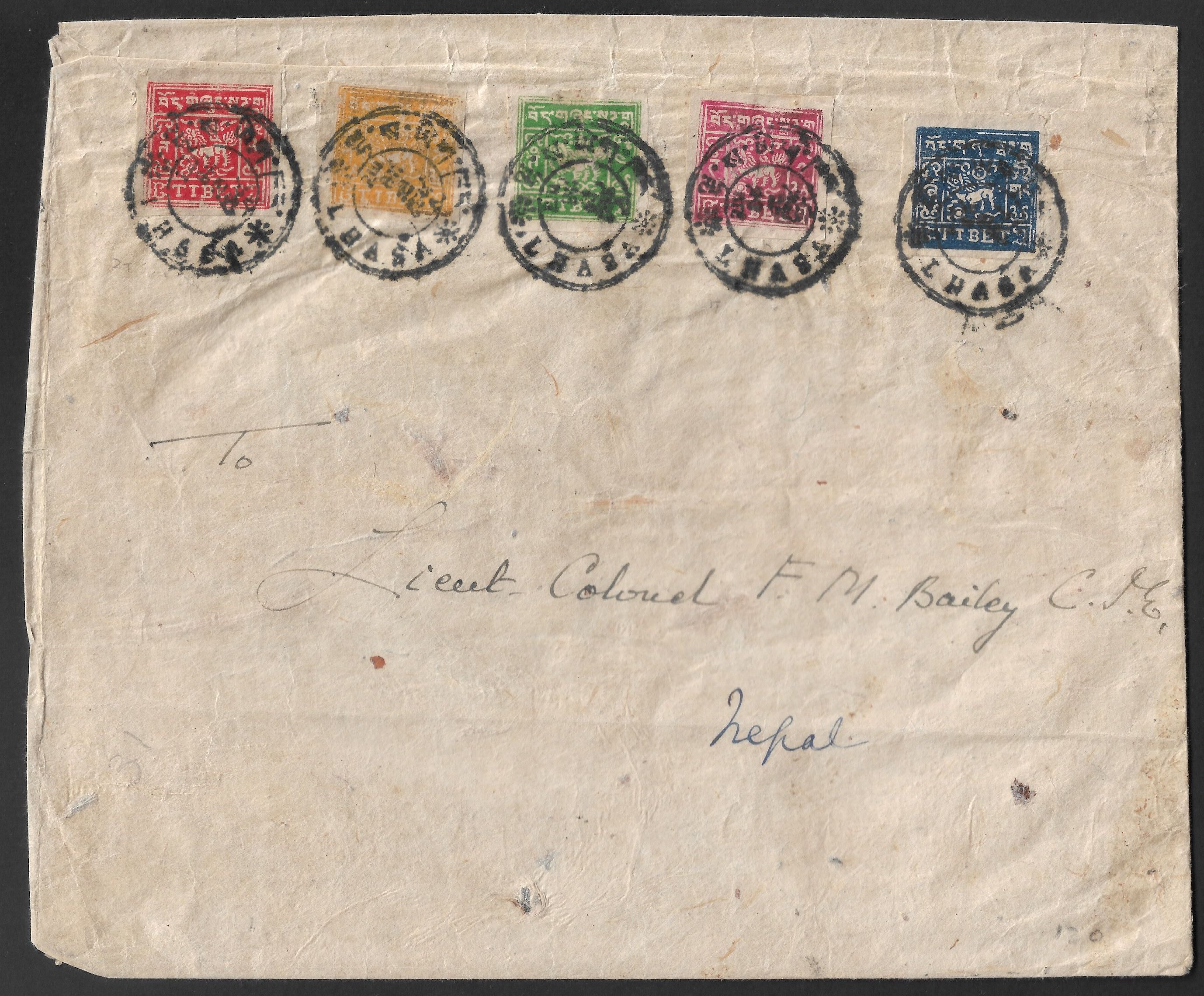 7197 imageTibet China 1933 ONLY KNOWN 5v cover from Lhasa to Colonel Bailey (British Minister to the Court of Nepal) - Historical Exhibition item! Ex. Rogers Auction #131(Image 1) (Image 2)