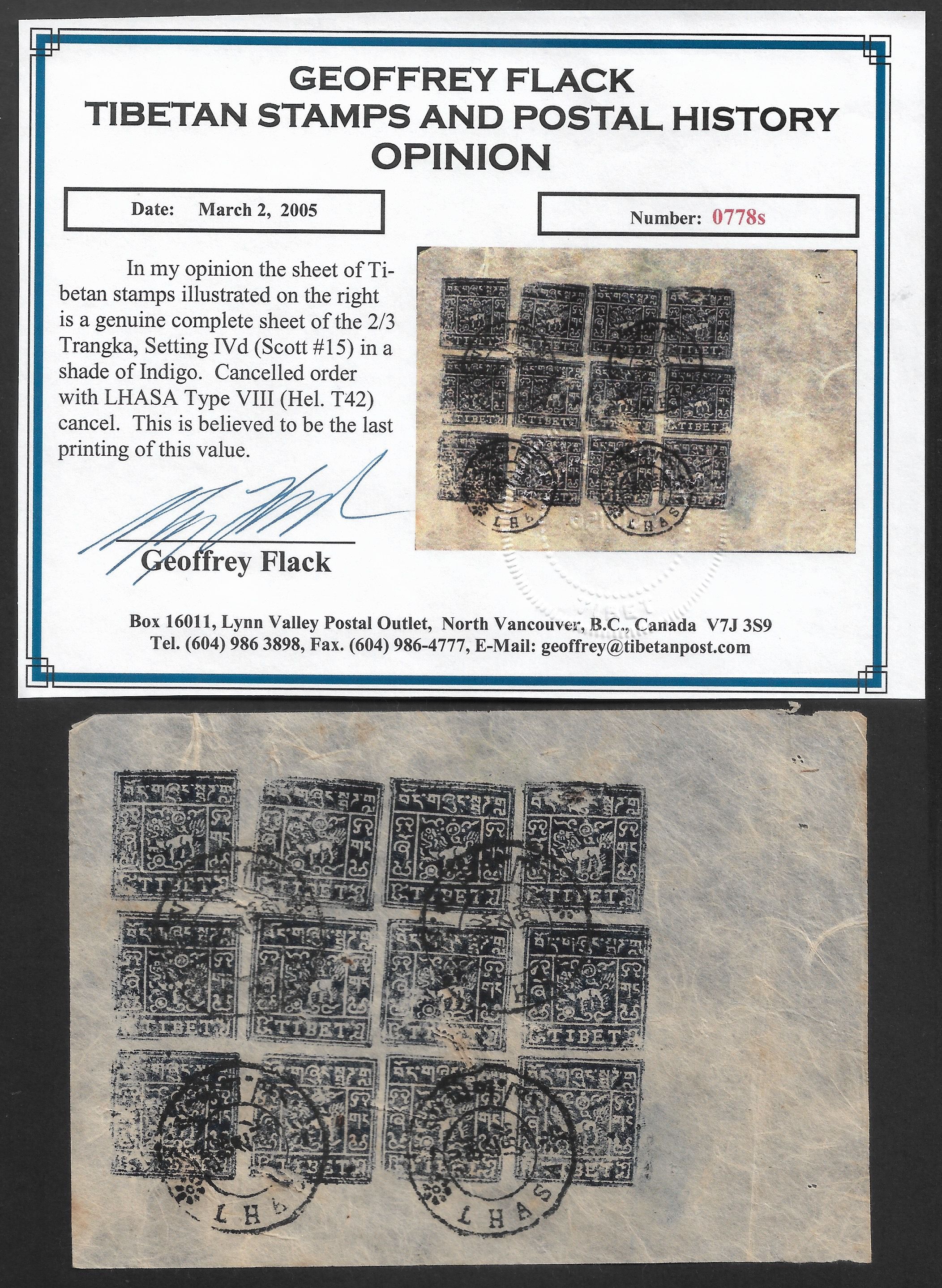 7199 imageTibet 1932 complete used 2/3tr sheet, Setting 4d (Sc#15) rare indigo shade, Hellrigl T#42, with Certificate(Image 1) (All Images)