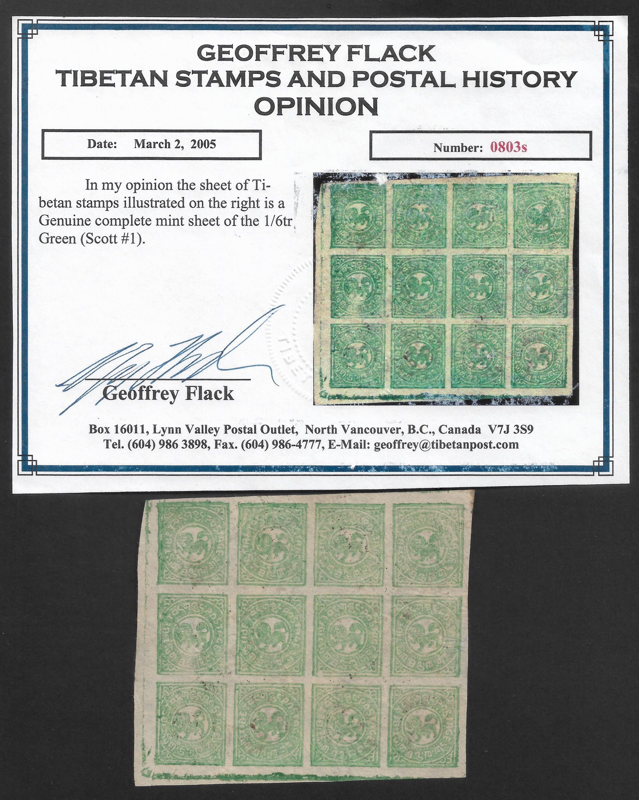 7200 imageTibet 1912 Very Rare First Issue complete unused sheet, Scott #1, green shade, with certificate(Image 1) (All Images)