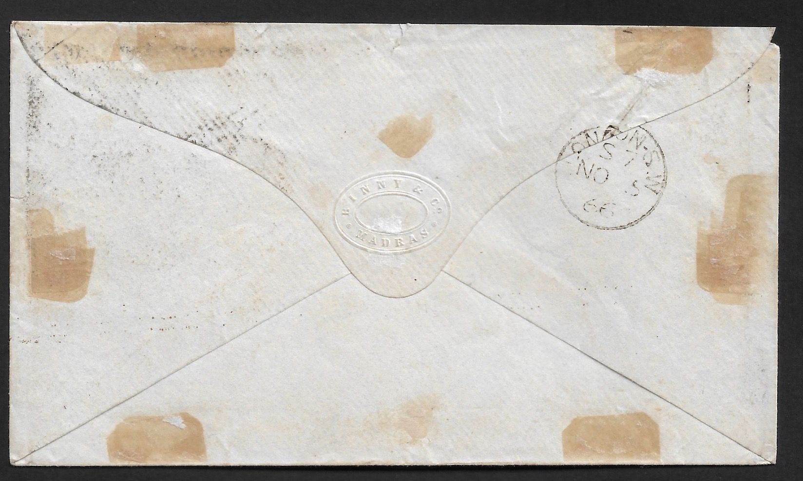 India 1866 VERY RARE SG 51 + 66 on Superb cover from Madras Per French Steamer via Marseilles, addressed to