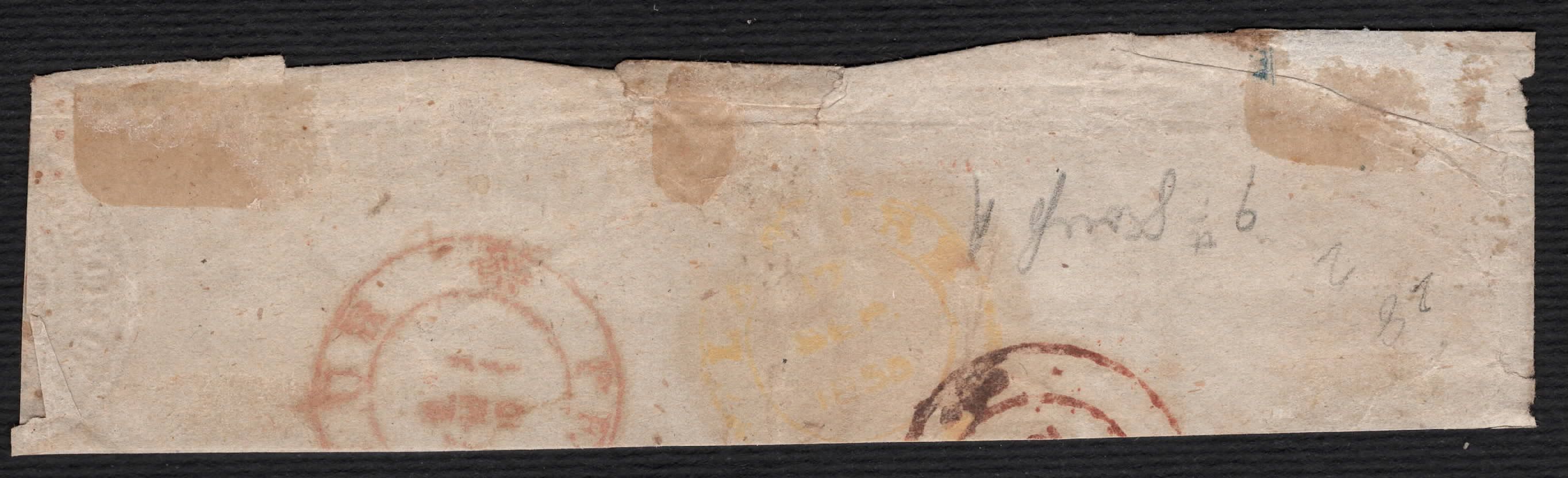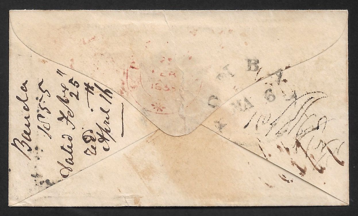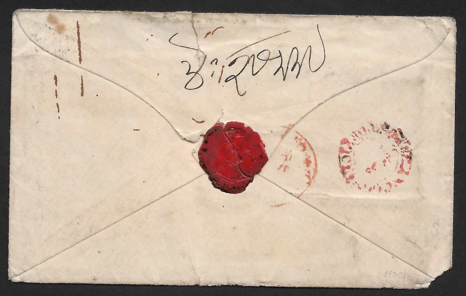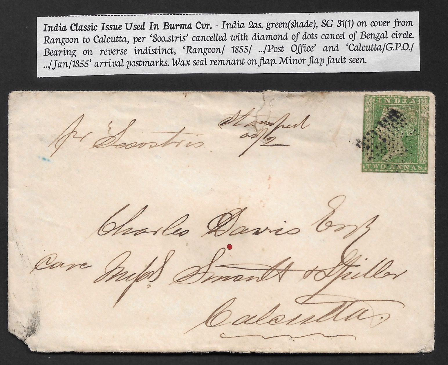 India 1854 2as Lithograph cover USED ABROAD Rangoon Burma to Calcutta with Wax seal at back(Image 1)