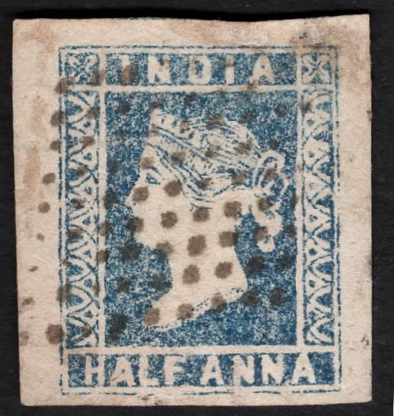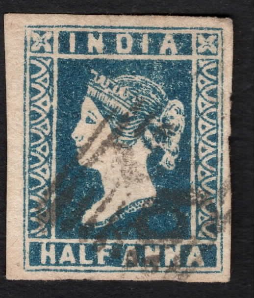 India 1855 Qv ½a, Imperf Lithograph stamp, Die III, SG 10, deep blue w/ large margins, cancelled w/ Cooper #4 Bombay