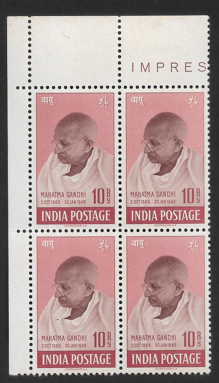 India 1948 10R Gandhi MNH Marginal positional block of 4 - Superb!(Image 1)