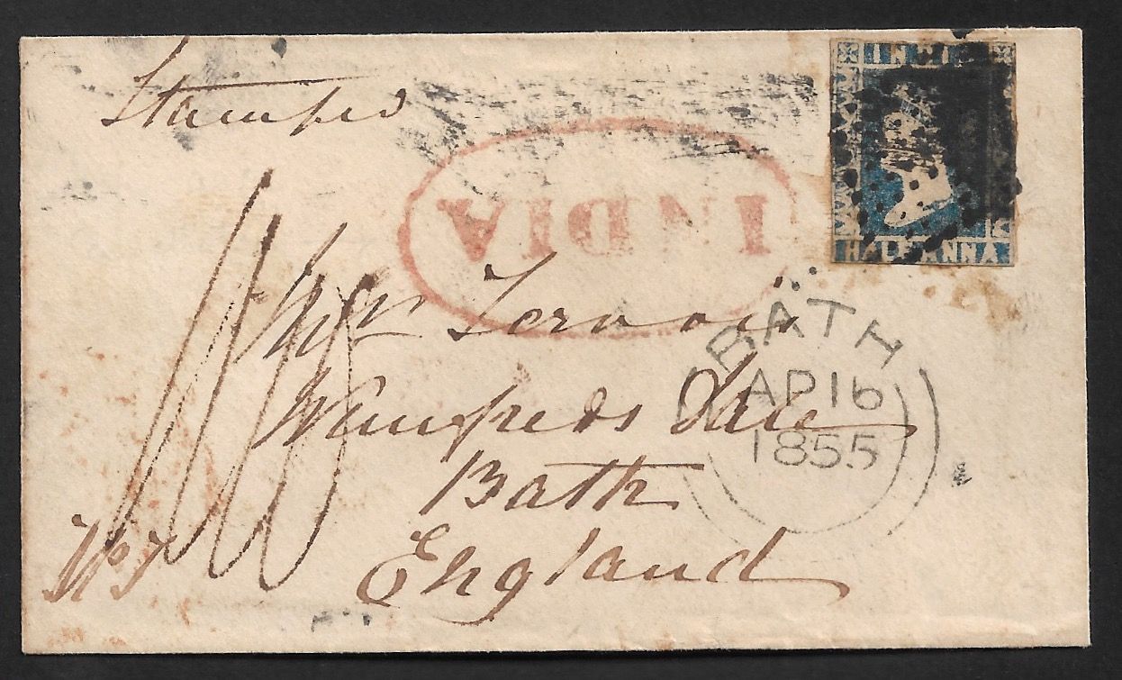 India 1854 1/2a Blue, SG2 Lithograph cover, sent from BANDA (Rarely seen on overseas mail from this town) via