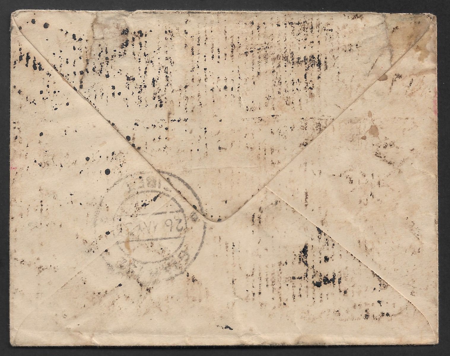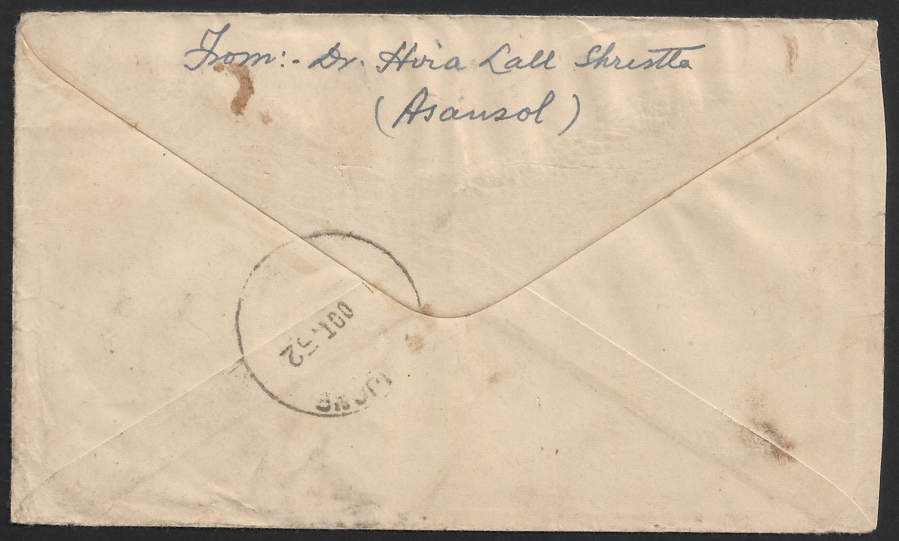 India 1858 QV ½a w/ Lion/ Palm blue seal on flap letter sheet uprated w/ ½a PS cut-out from Krishnagar to Calcutta(Image 1)