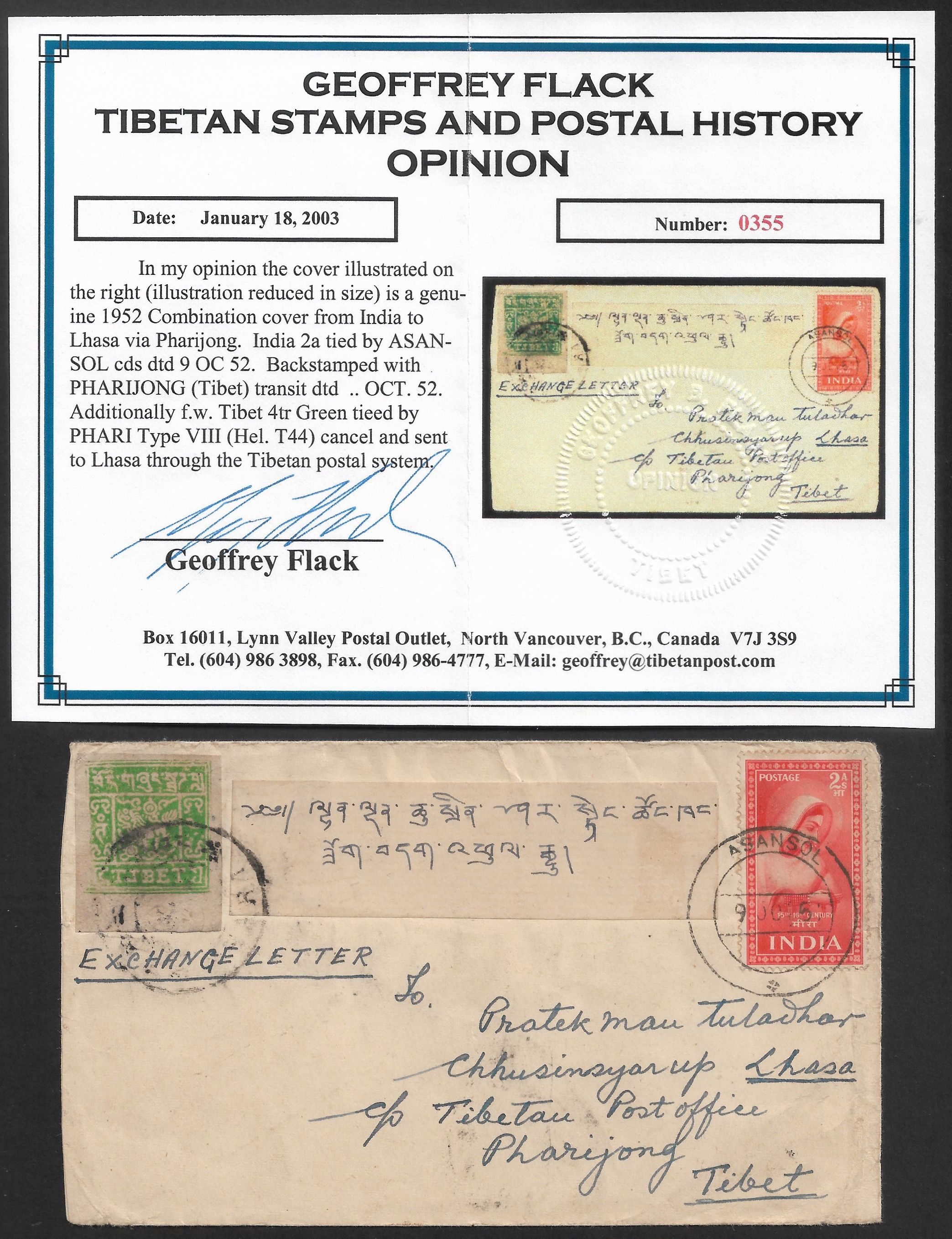 India 1952 Very Rare combination cover to Lhasa via Pharijong, franked with 2as Poet series stamp and 4tr Tibet