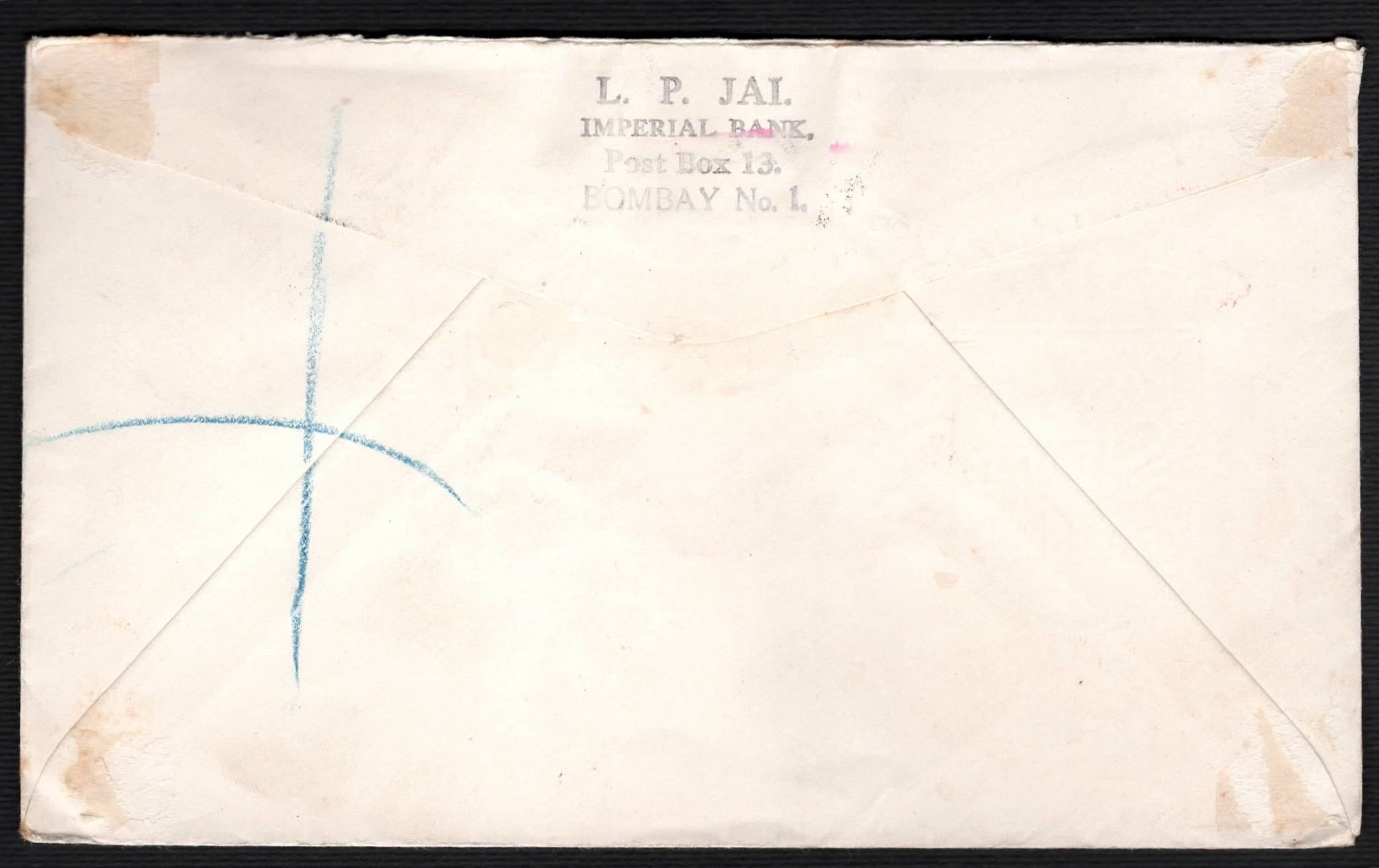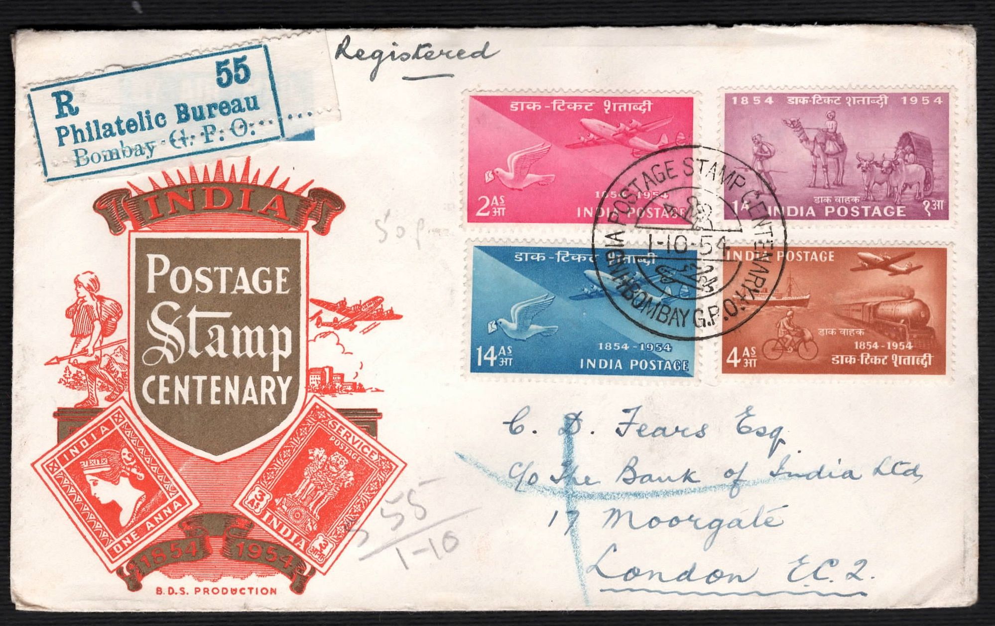 India 1st October 1954 4v Private Registered FDC from Bombay to London depicting the Famous 1a stamp from 1854(Image 1)