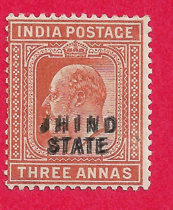 7057 imageIndia Jind State 1903-09 KE 3as orange-brown w/T-3 OVPT DOUBLE SG 48a LH Cat £160(Image 1) (All Images)