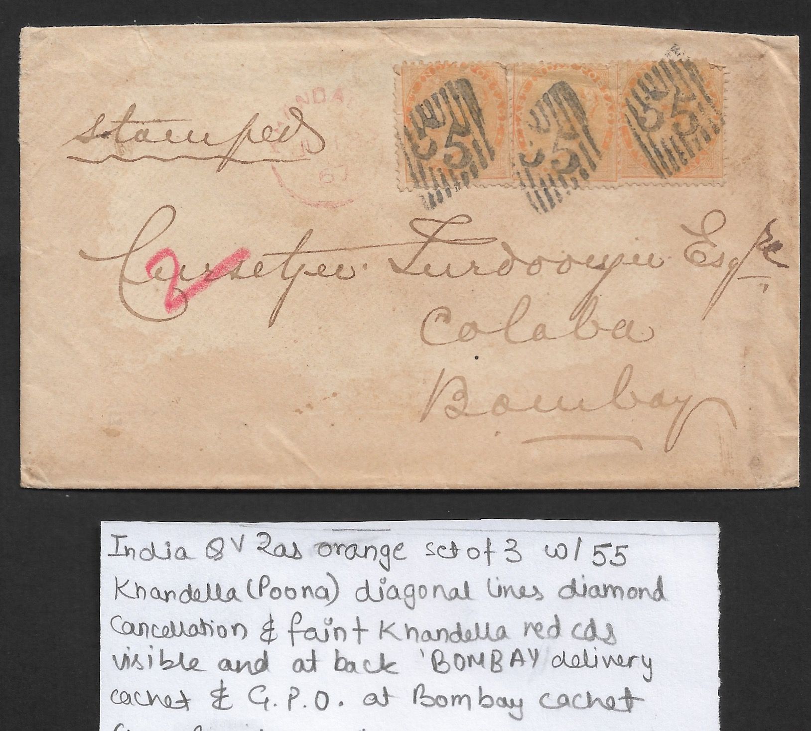 1027 imageIndia QV 2a orange strip of 3 (SG 55) Khandalla to Bombay, ‘55’ diamond cancel, addressed to Colaba, attractive franking(Image 1) (Image 2)