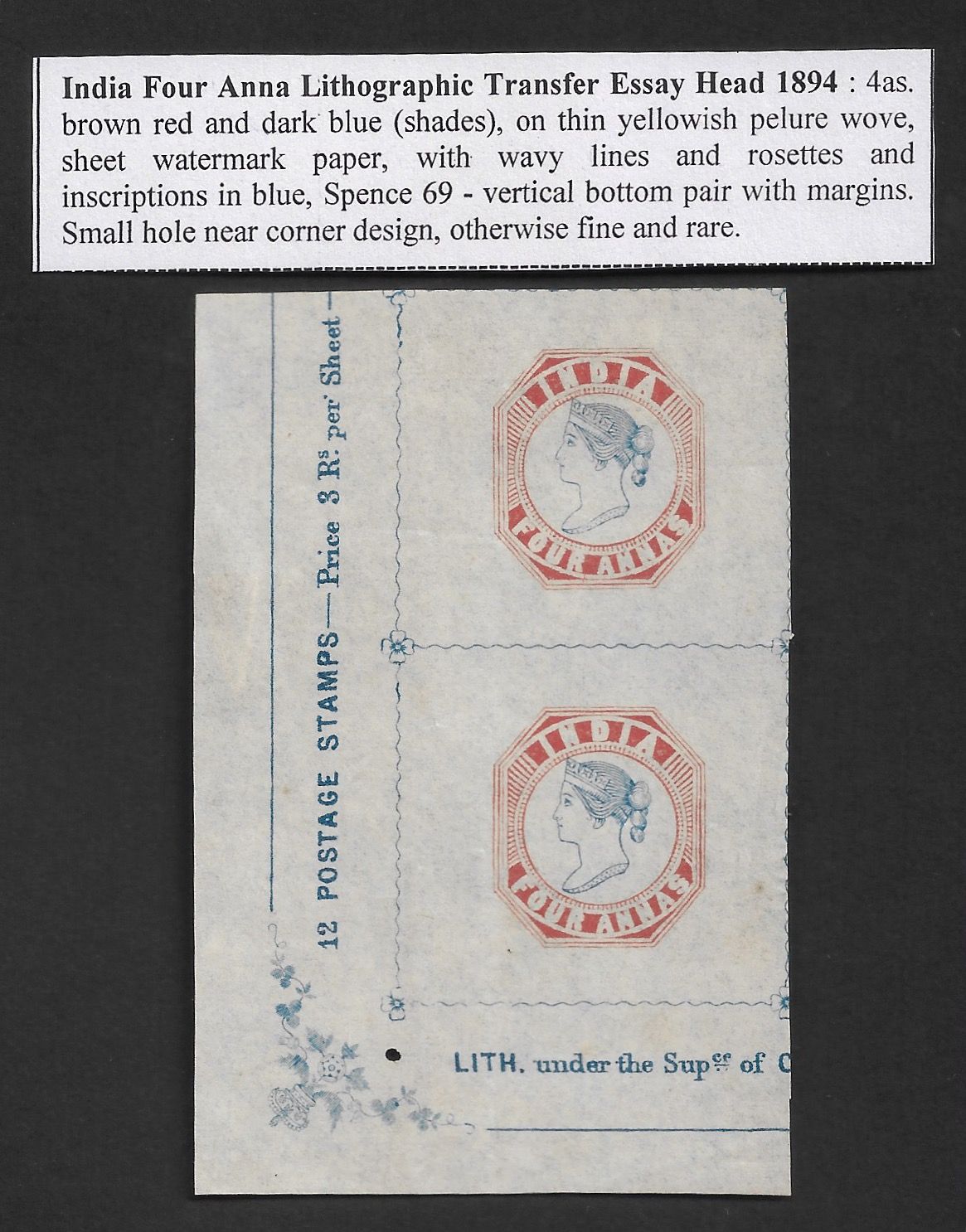 1036 imageIndia 1894 4as Lithographic Transfer Essay, brown-red & dark blue, Spence 69, vertical bottom pair with margins, pelure wove paper, scarce and attractive with sheet inscriptions(Image 1) (Image 2)