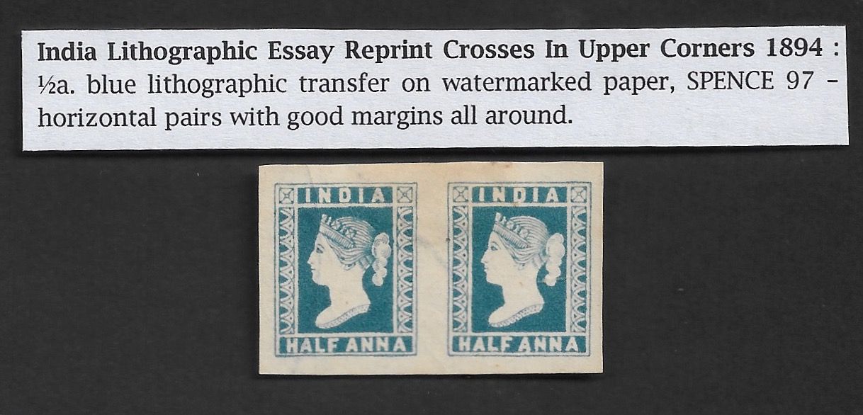 1037 imageIndia 1894 Lithographic Essay Reprint ½a Blue, Crosses in Upper Corners, Spence 97 horizontal pair on watermarked paper, wide margins, scarce(Image 1) (Image 2)