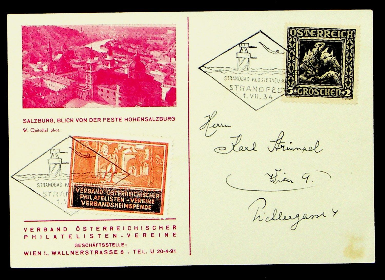 Austria 1934 Salzburg view PC w/ "Strandbad Klosterneuburg STRANDFEST" cachet & Philatelists Association label(Image 1)