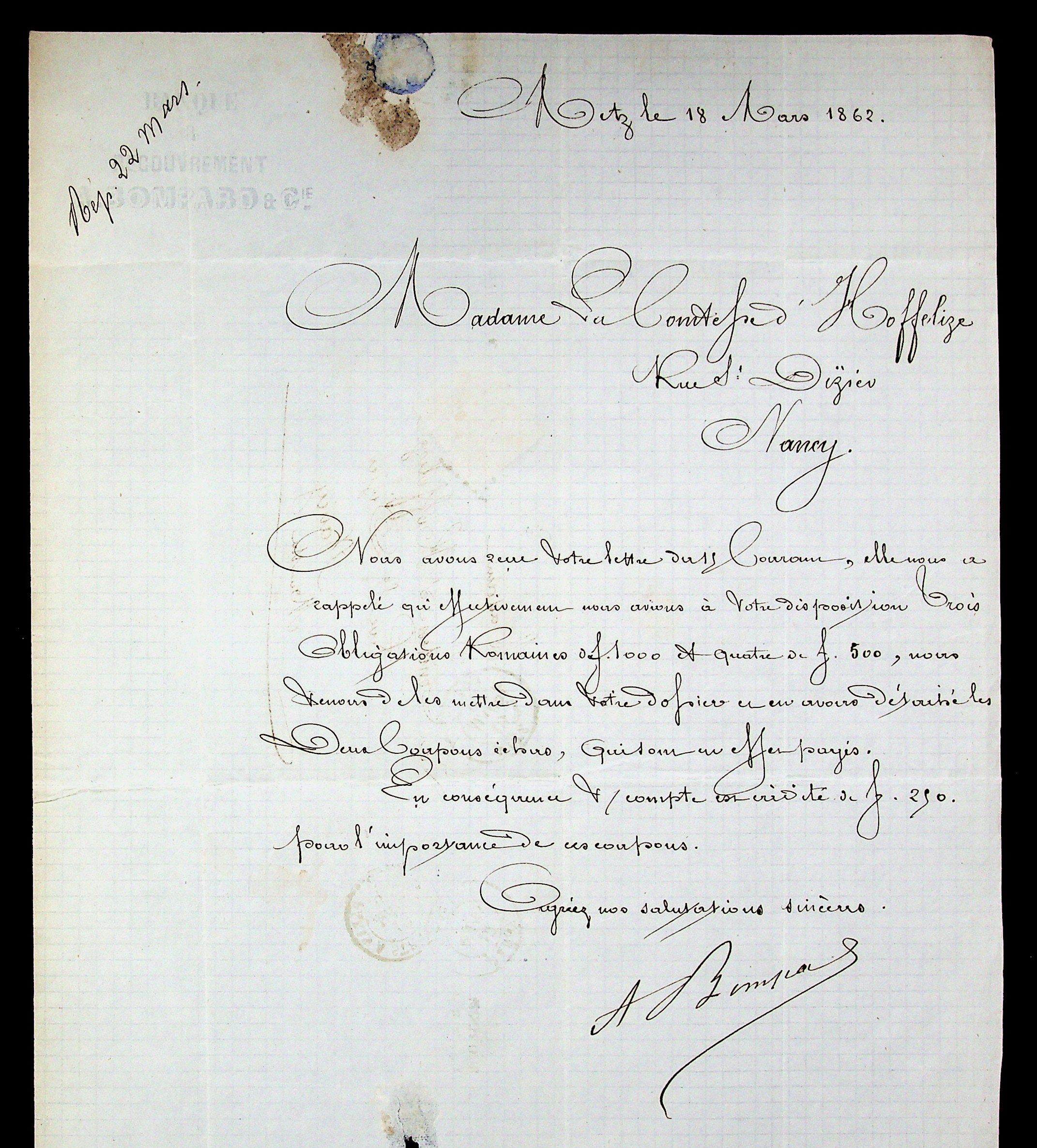 France 1862 Napoleon III 20c Imperf on financial cover cancelled w/ “4977” within diamond of dots from Metz to Nancy(Image 1)