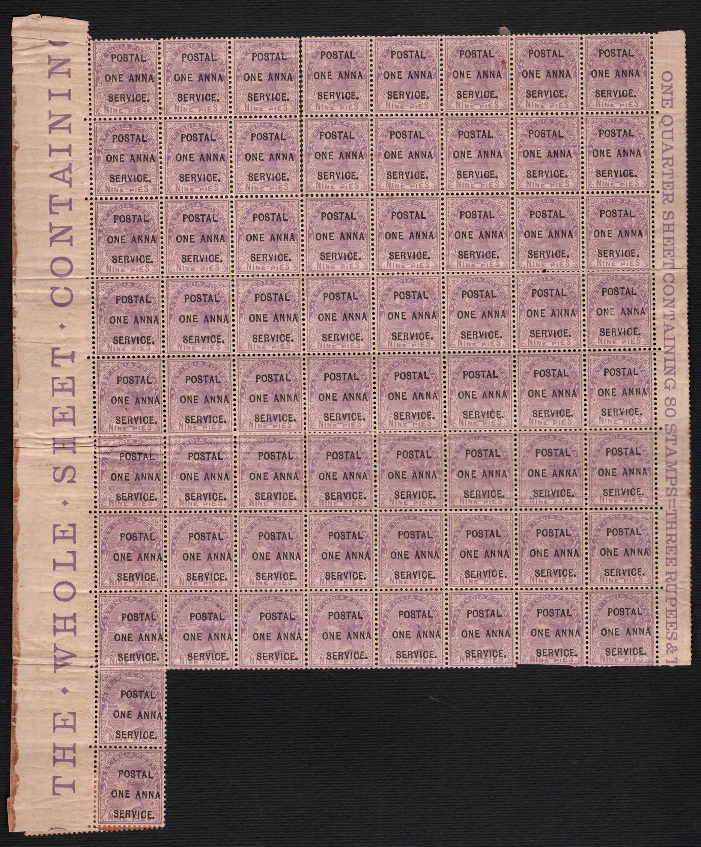East India Official 9p deep mauve, overprinted Postal Service One Anna, part sheet of 66, showing full marginal