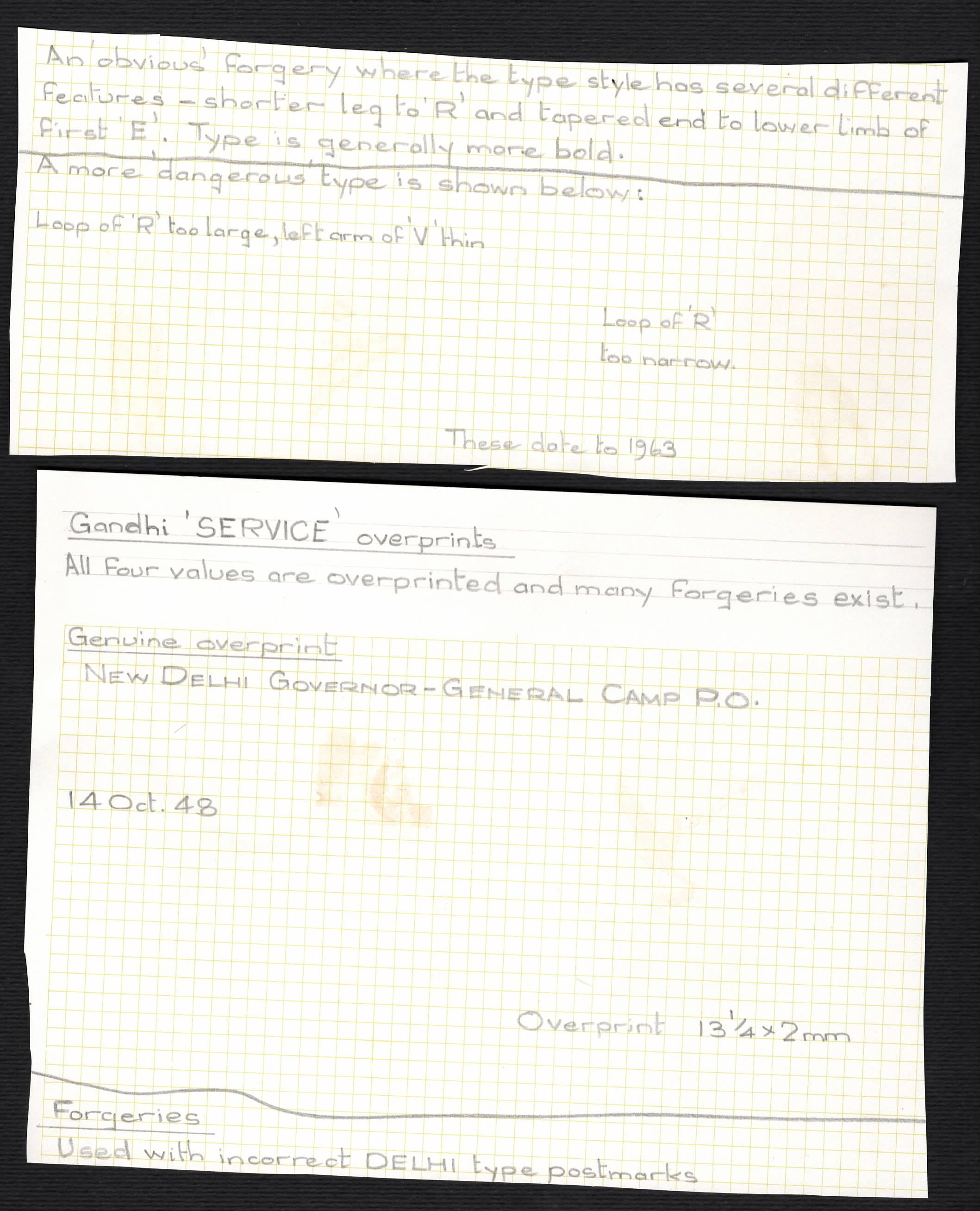 India 1948 Gandhi “SERVICE” Overprints – Genuine & Forged examples study, detailed philatelic reference display page -
