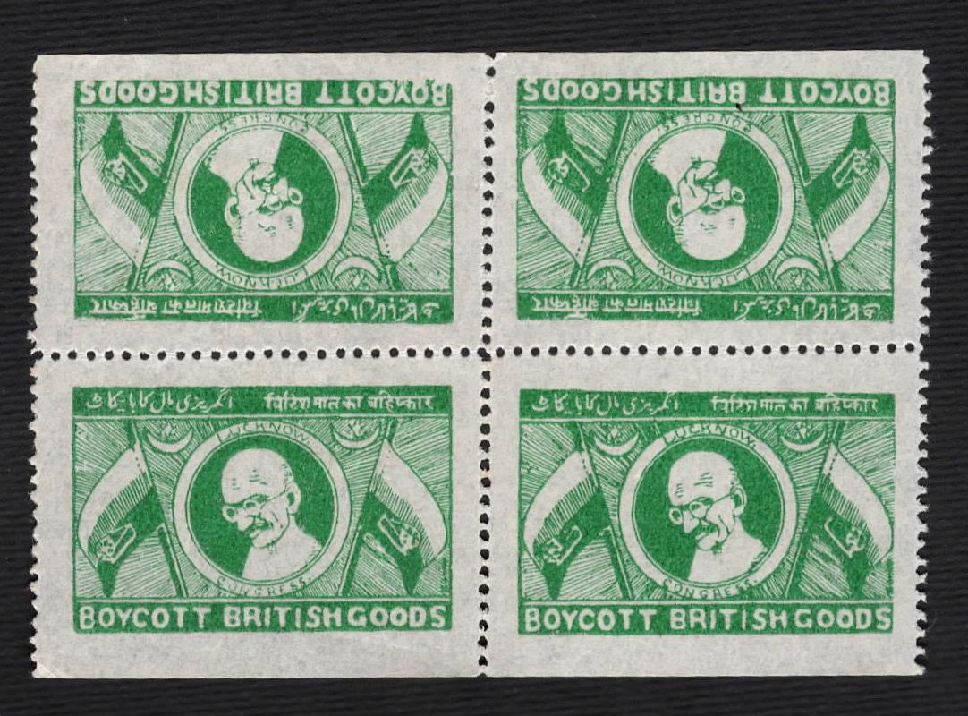India 1930s Gandhi “Boycott British Goods” label unused block of 4, green, Tete-Beche. Iconic nationalist propaganda