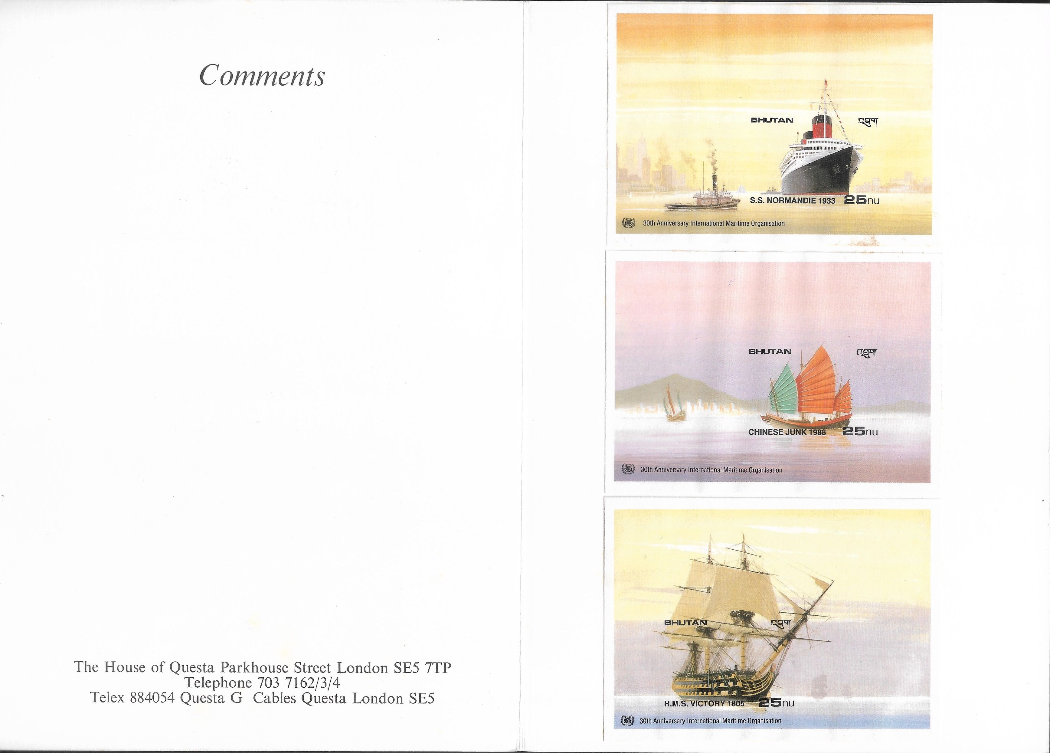 7018 imageBhutan 1995 25Nu very rare Unique Ships - Chinese Junk, HMS Victory & SS Normandie, House of Questa 3 Proofs on card - Exceptional(Image 1) (Image 2)