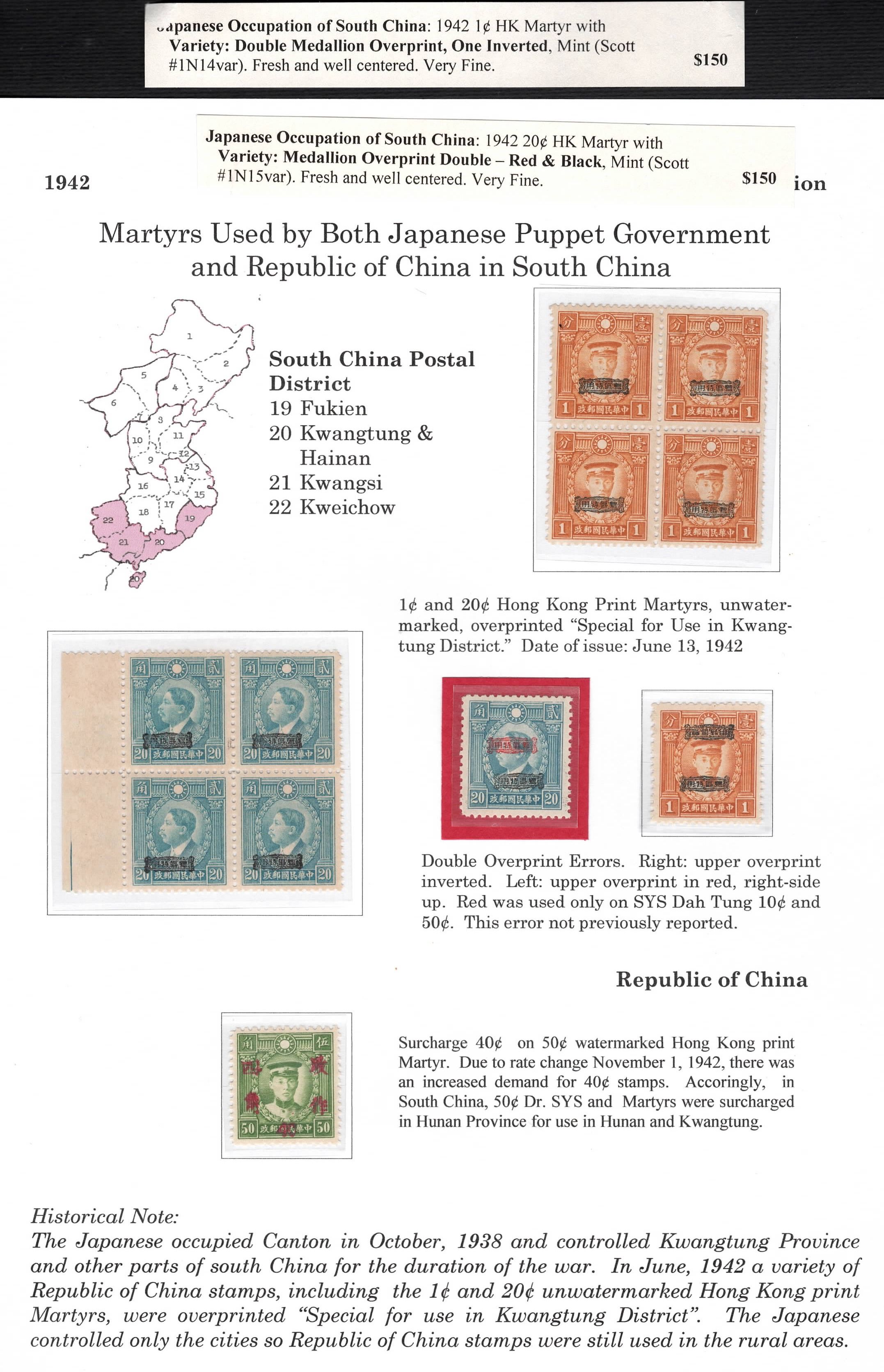 7077 imageChina 1942 Japanese Occupation of South China – 1¢ & 20¢ Hong Kong Martyrs with “Special for Use in Kwangtung District” overprints, including double medallion errors, one inverted; scarce and very fine.(Image 1)