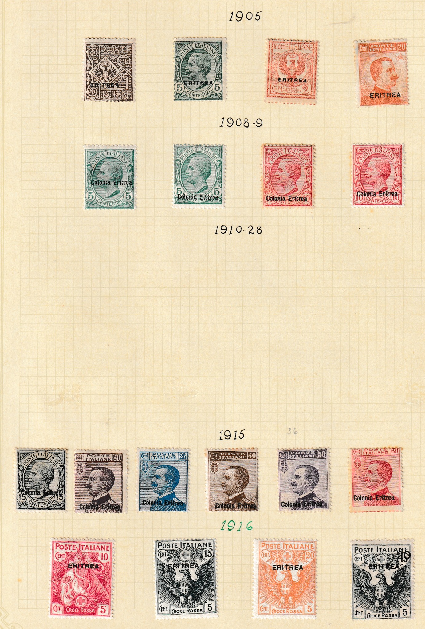 842 imageERITREA: Useful mint collection on leaves including 1895 to 45c, 1903 10c red (Cat £100), 1916 Red Cross set, 1922 surcharge on Benadir set, 1923 Fascist set, 1927 Volta set, 1929 Montecassino set, 1930 Agricultural set, 1934 Colonial Exhib. set, Express Letter 25c & 30c (Cat £224), etc, huge catalogue value. (Approx 180).